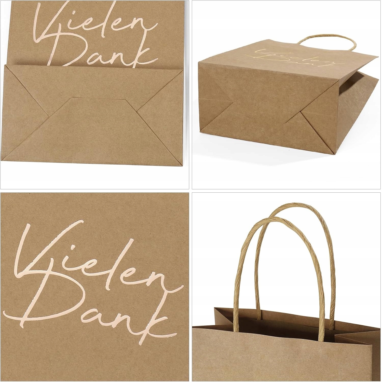 Właściwości produktu: Torebki na prezenty mają nadrukowane słowa “Dziękuję” w j. niemieckim z delikatnym tłoczeniem w kolorze różowego złota. Torebki są bardzo stabilne i nadają się do ponownego użytku.