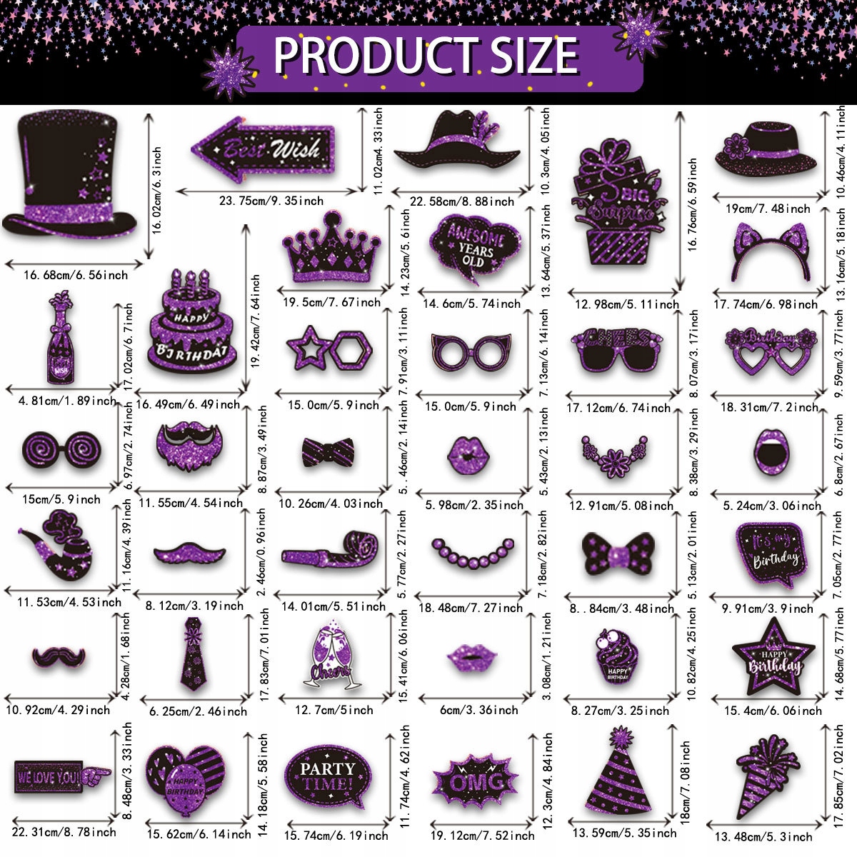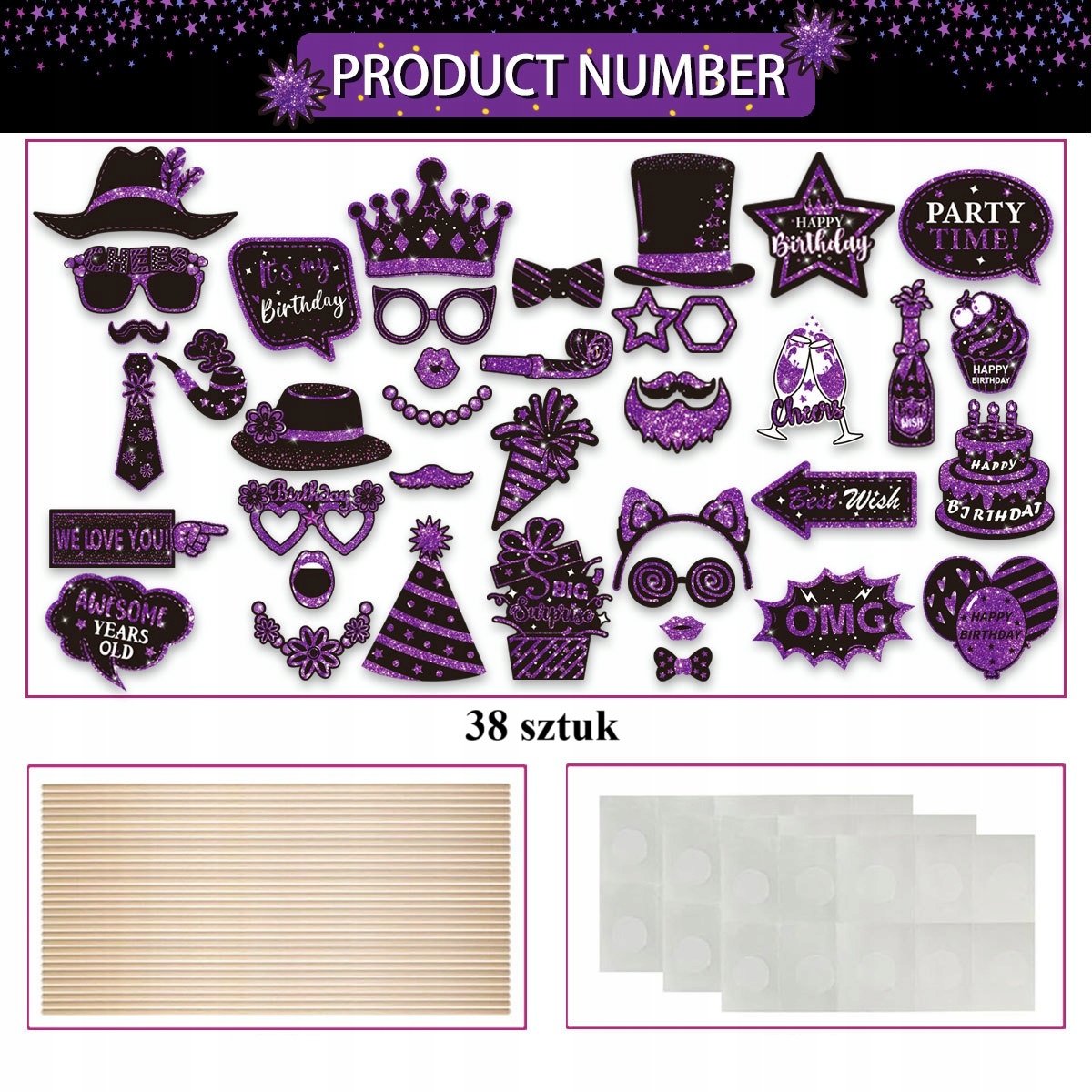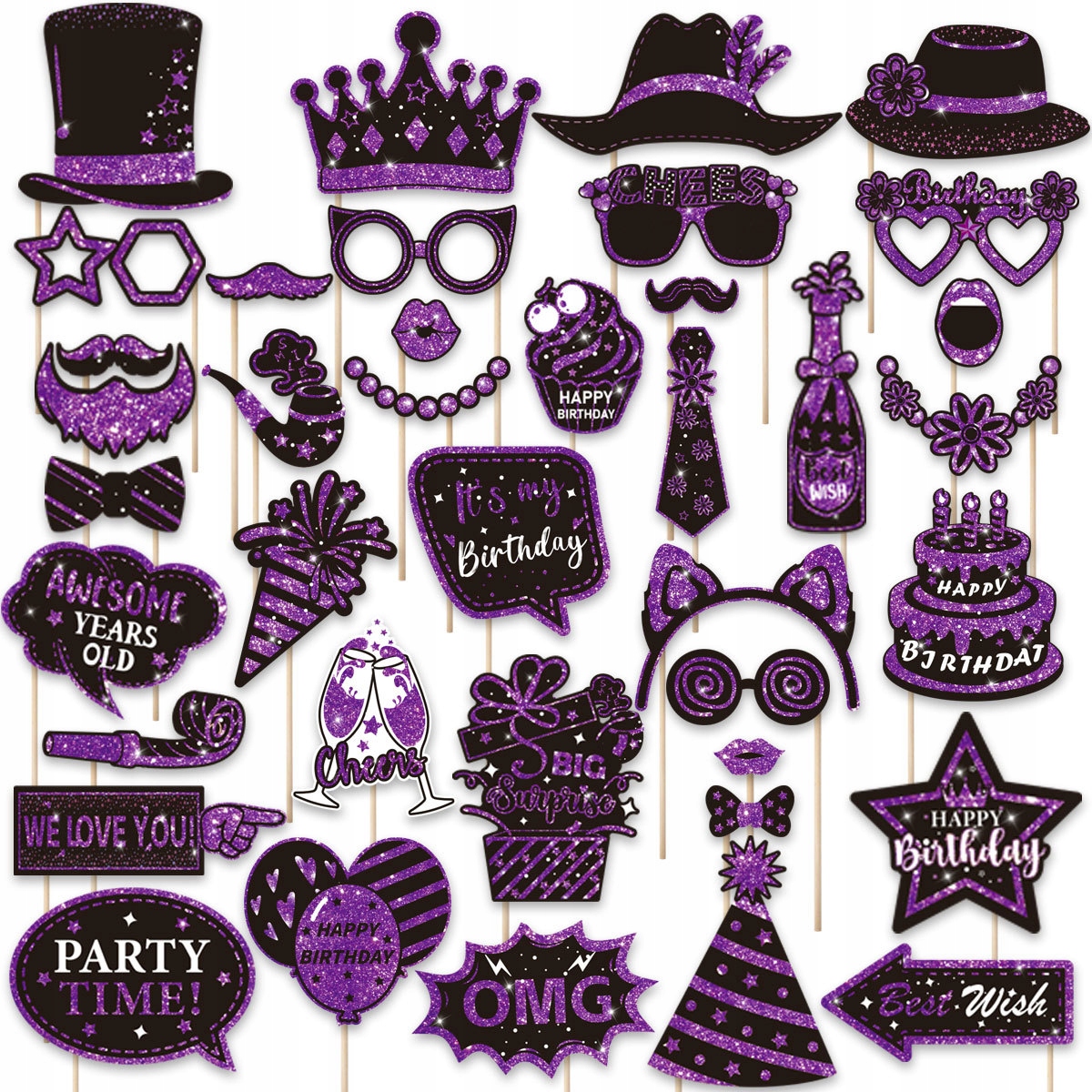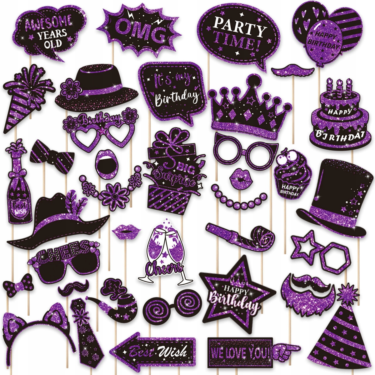 Gadżety / Rekwizyty do Zdjęć – Zestaw 38 sztuk (Czerń i Fiolet) na Urodziny, Imprezy, Selfie i Fotobudkę