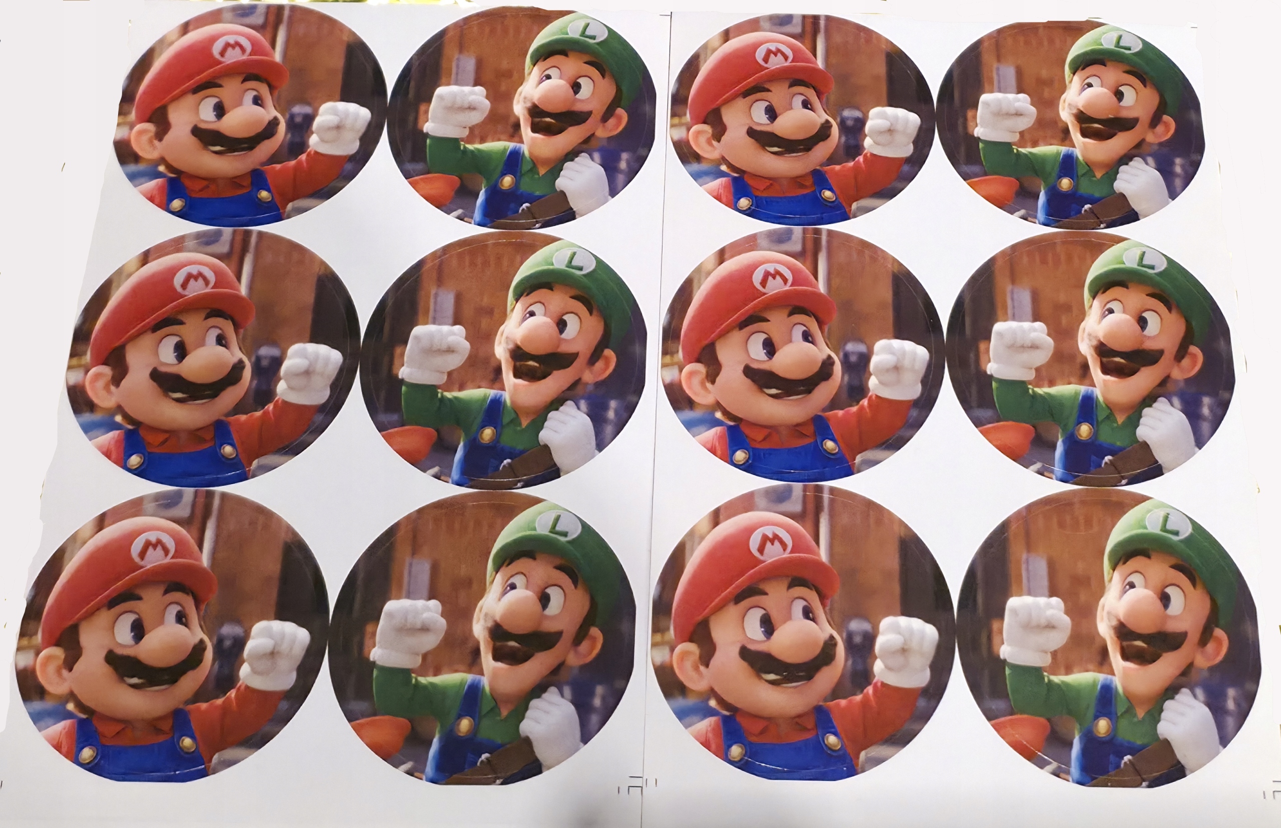 - 12 okrągłych naklejek 6 sztuk Mario i 6 sztuk Luigi.