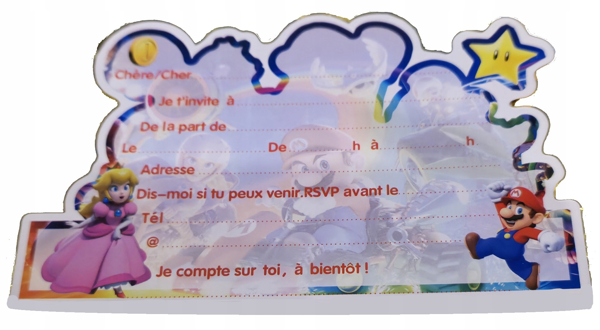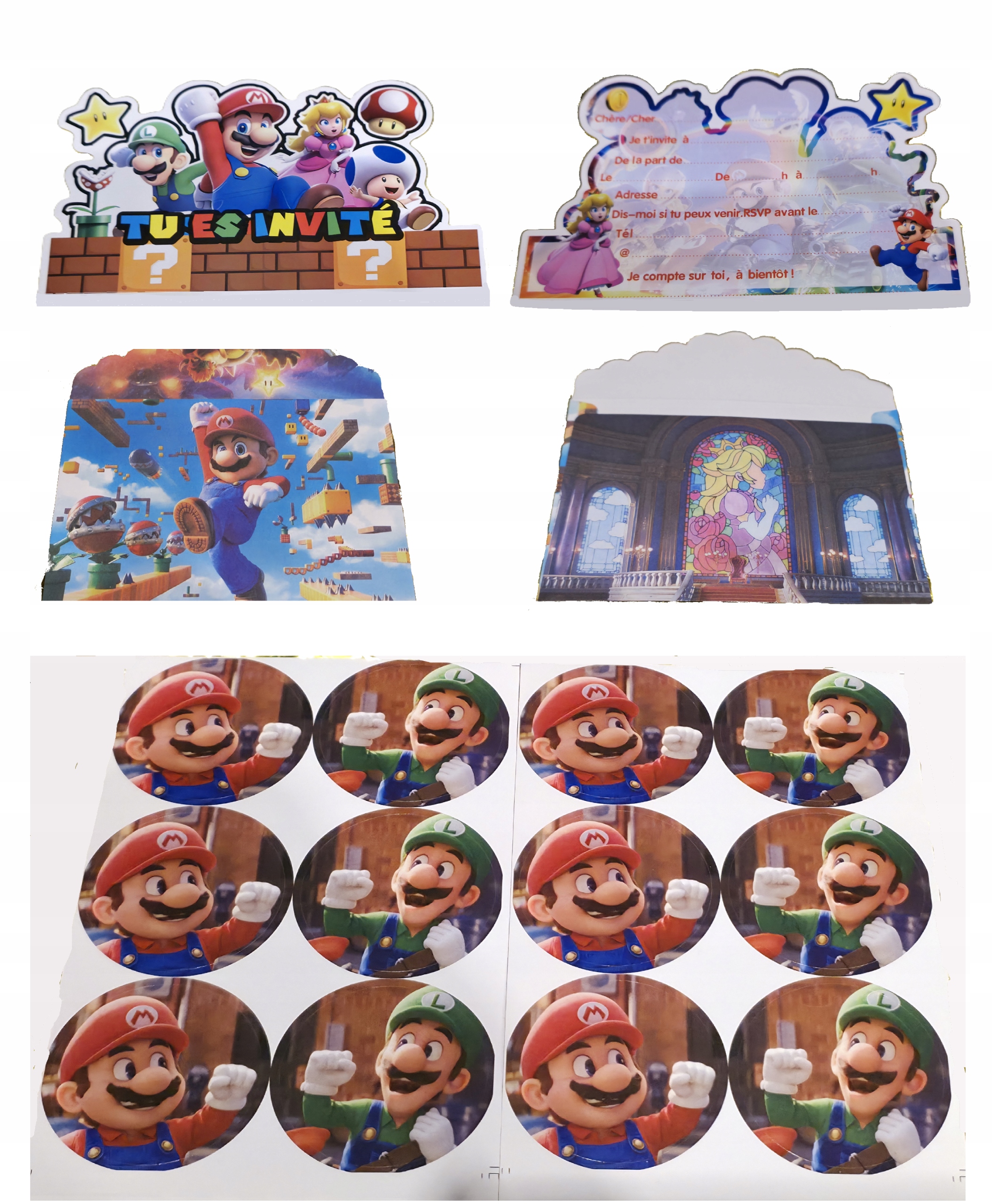 ZAPROSZENIA URODZINOWE DLA DZIECI SUPER MARIO w j.francuskim + KOPERTY + NAKLEJKI