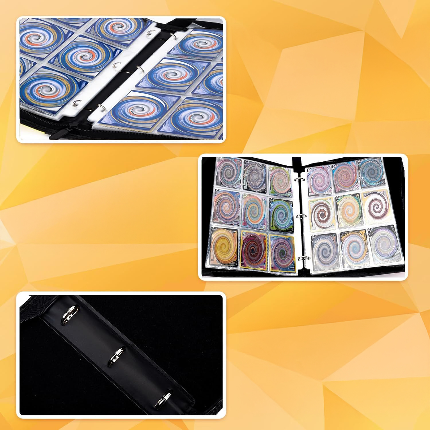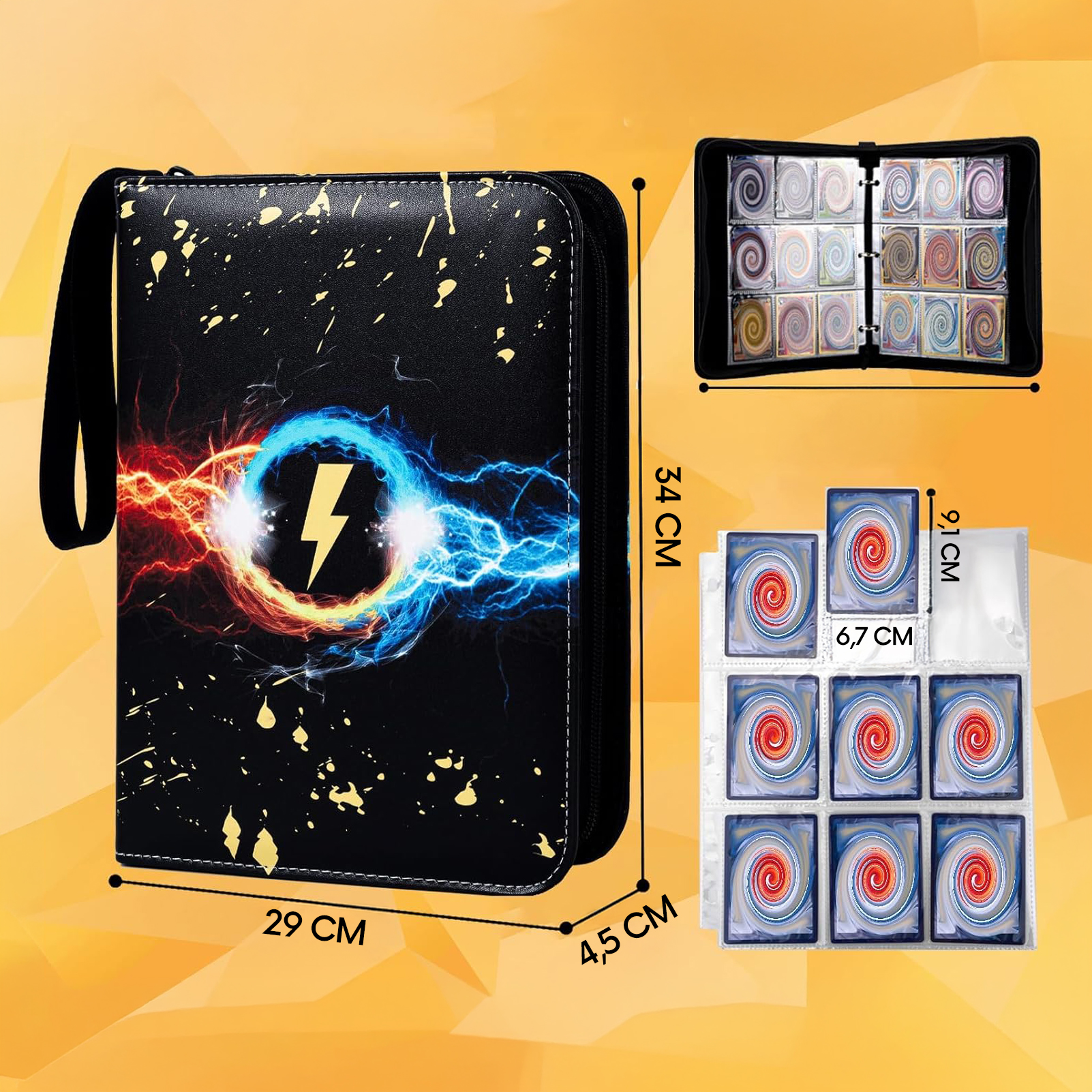 Album mieści aż 900 kart dzięki 50 stronom przezroczystych koszulek. Standardowy rozmiar kieszeni sprawia, że jest kompatybilny z wszystkimi klasycznymi kartami kolekcjonerskimi (Pokémon, One Piece, Lorcana, Yu-Gi-Oh!, MTG, itp.).
