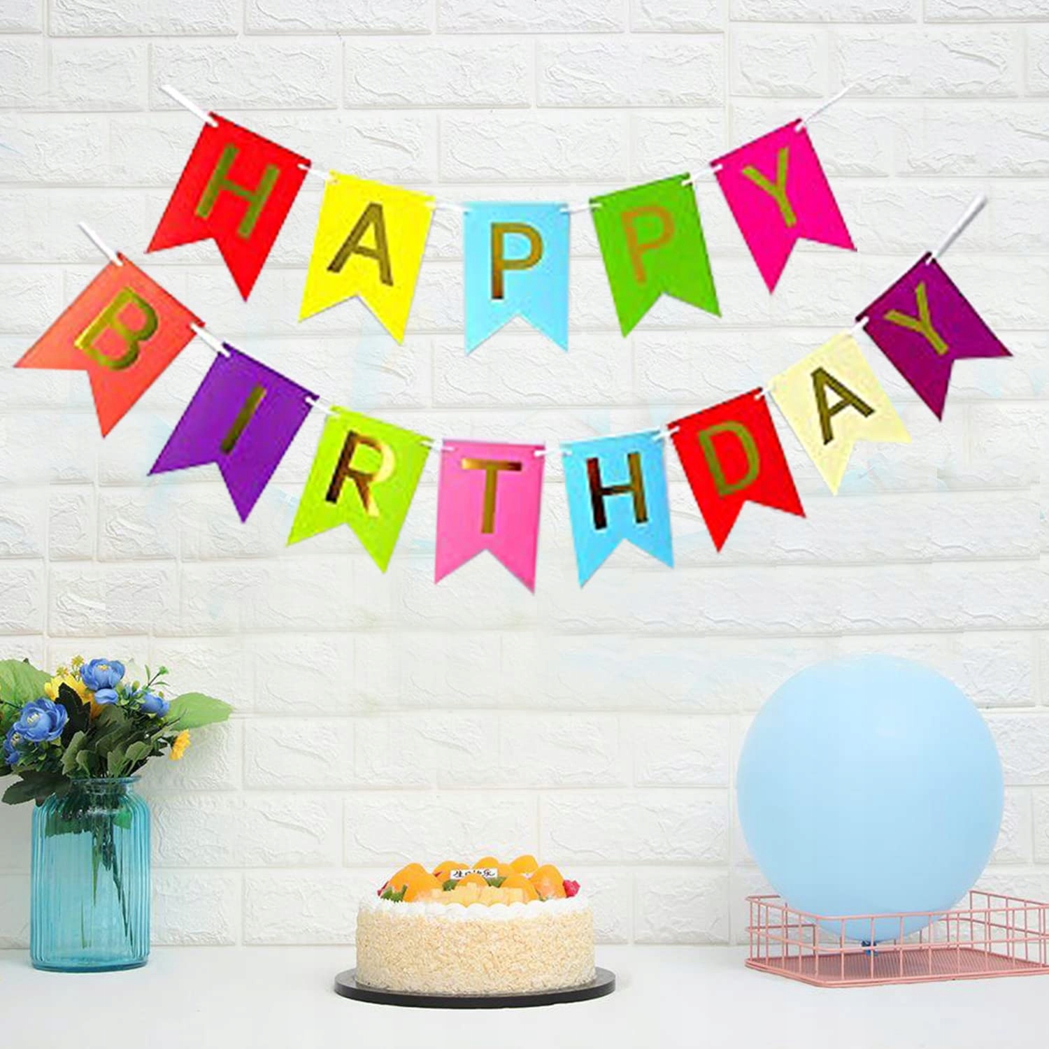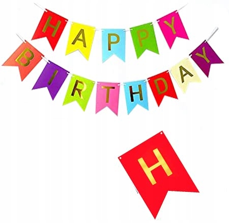 KOLOROWA GIRLANDA ZE ZŁOTYM NAPISEM HAPPY BIRTHDAY. Ten komplet dekoracji to idealny wybór dla każdego!