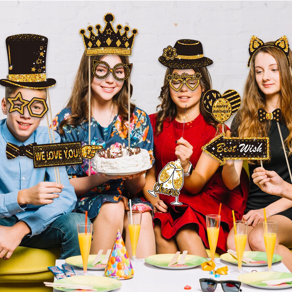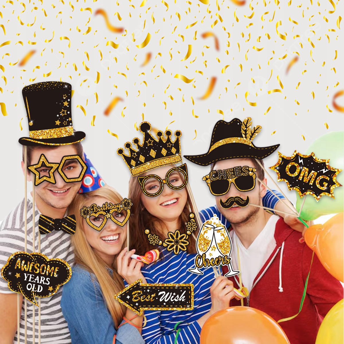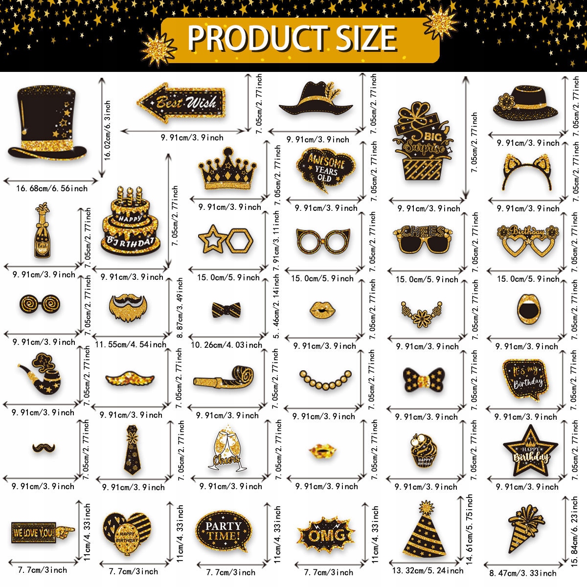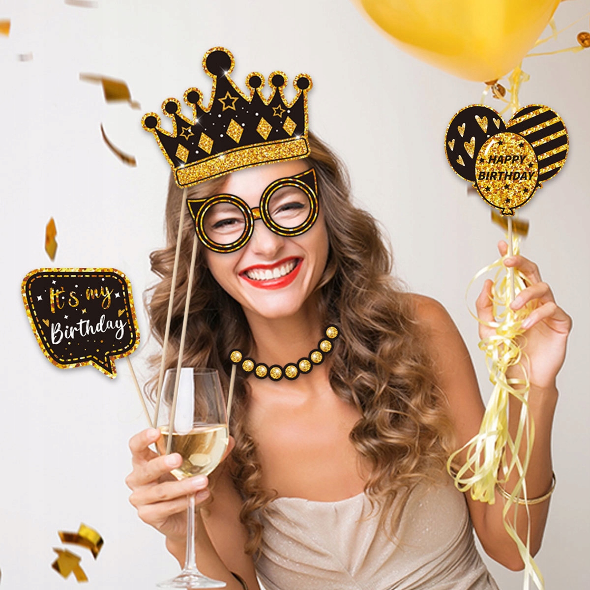 Gadżety / Rekwizyty do Zdjęć – Zestaw 38 sztuk (Czerń i Złoto) na Urodziny, Imprezy, Selfie i Fotobudkę
