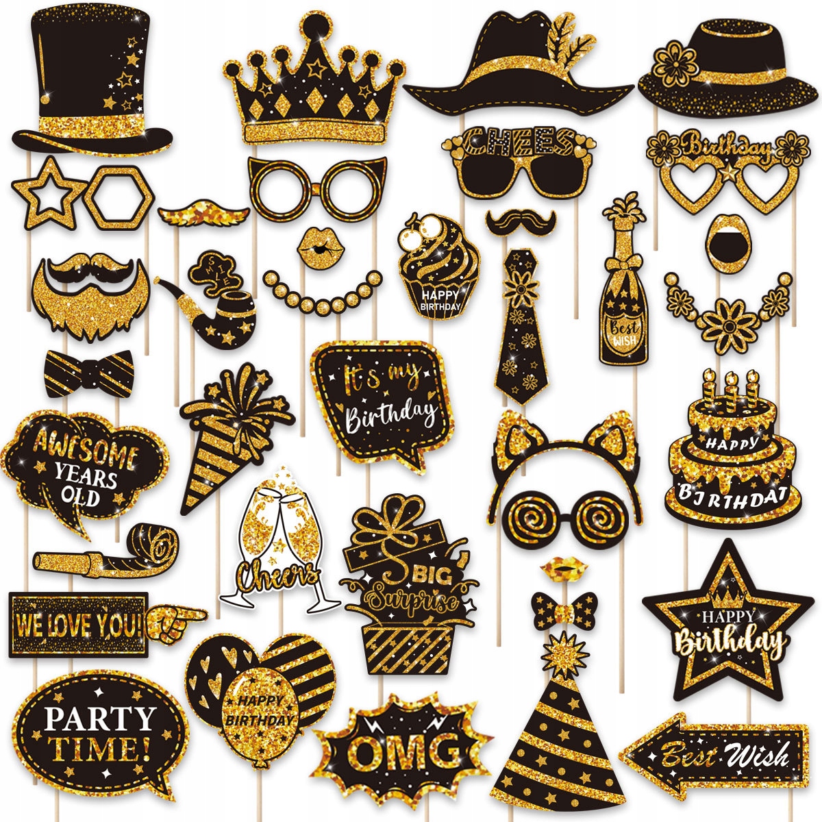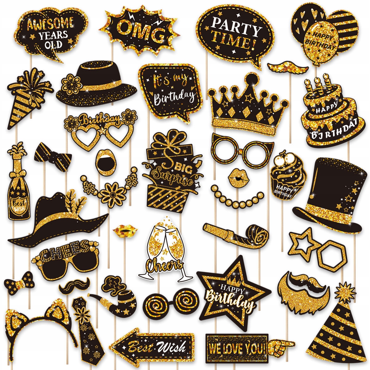 Zawartość zestawu: 38 elementów do zdjęć na imprezy, wesela, urodziny, w kolorach złotym i czarnym. Zestaw zawiera różnorodne rekwizyty, idealne do sesji zdjęciowych na przyjęciu.