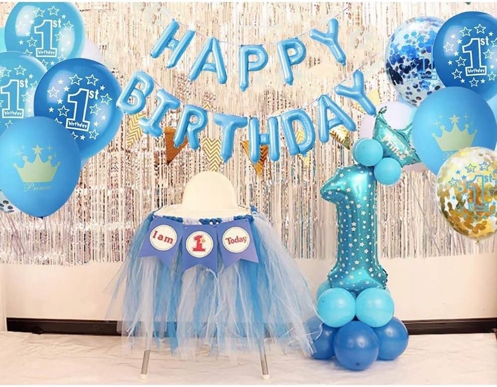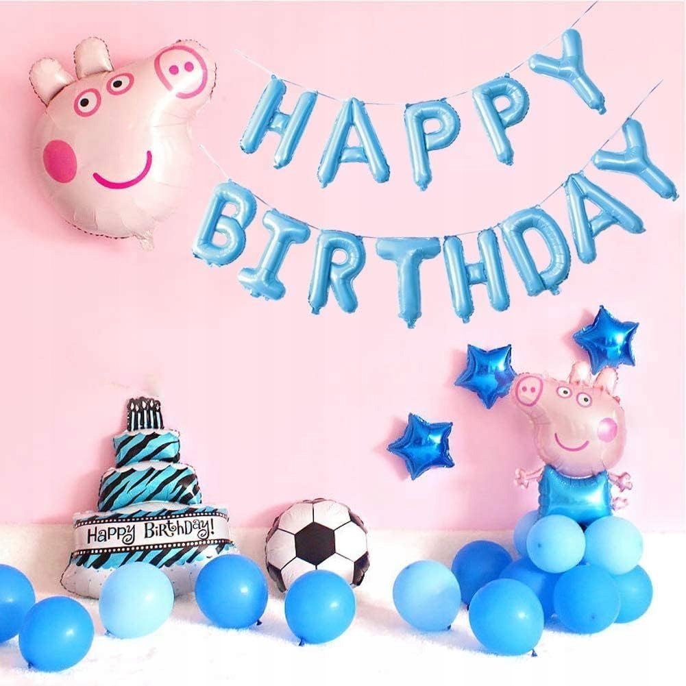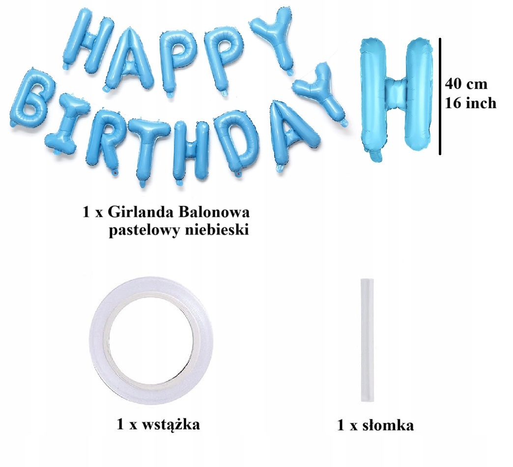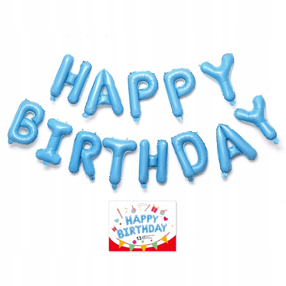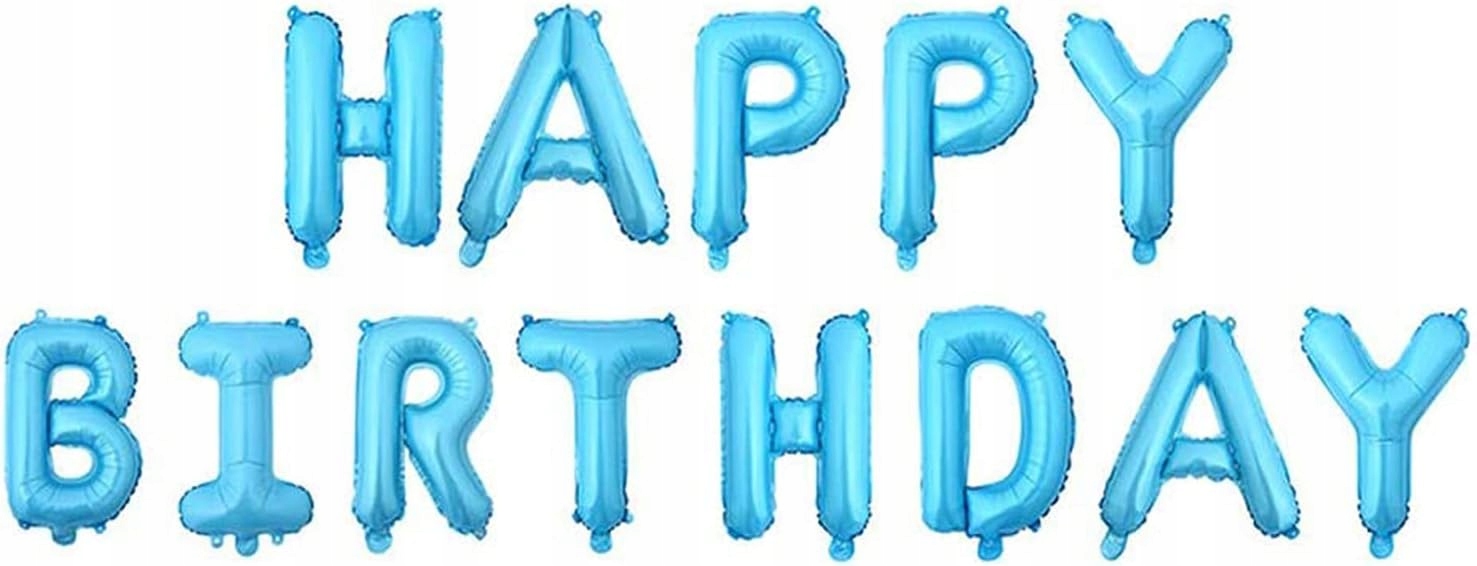 - 1 x balon foliowy napis Happy Birthday – kolor niebieski, wysokość liter ok. 40 cm / 16 inch (każda litera osobny balon)