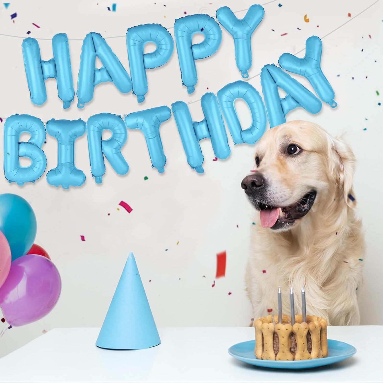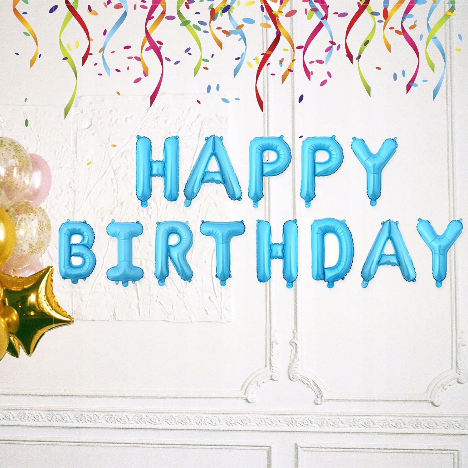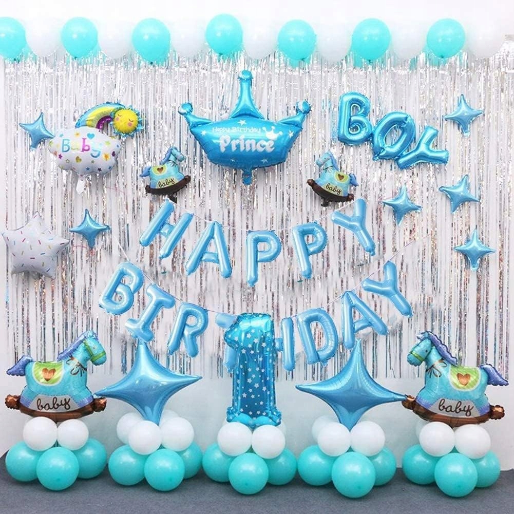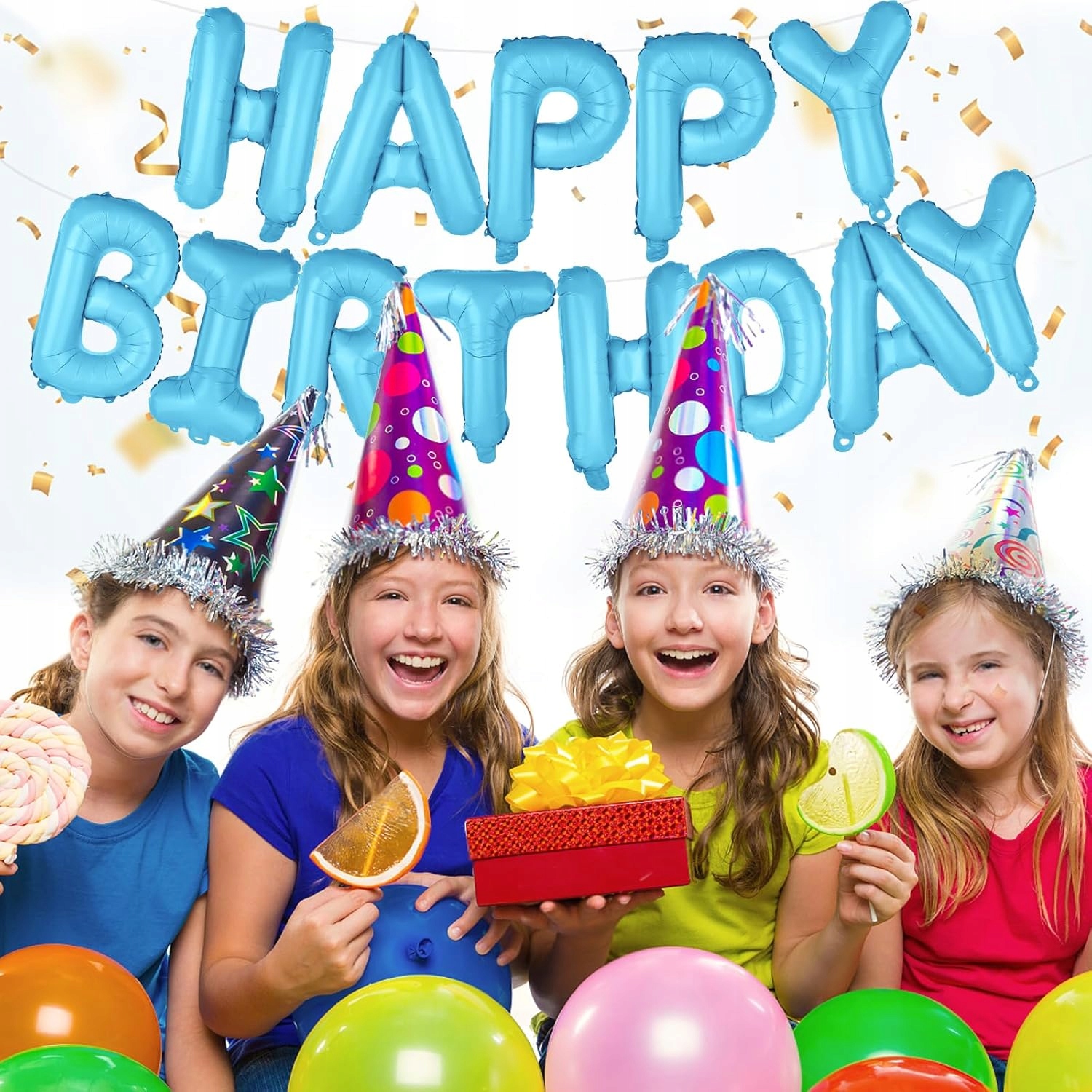 - 1 x balon foliowy napis Happy Birthday – kolor niebieski, wysokość liter ok. 40 cm / 16 inch (każda litera osobny balon)