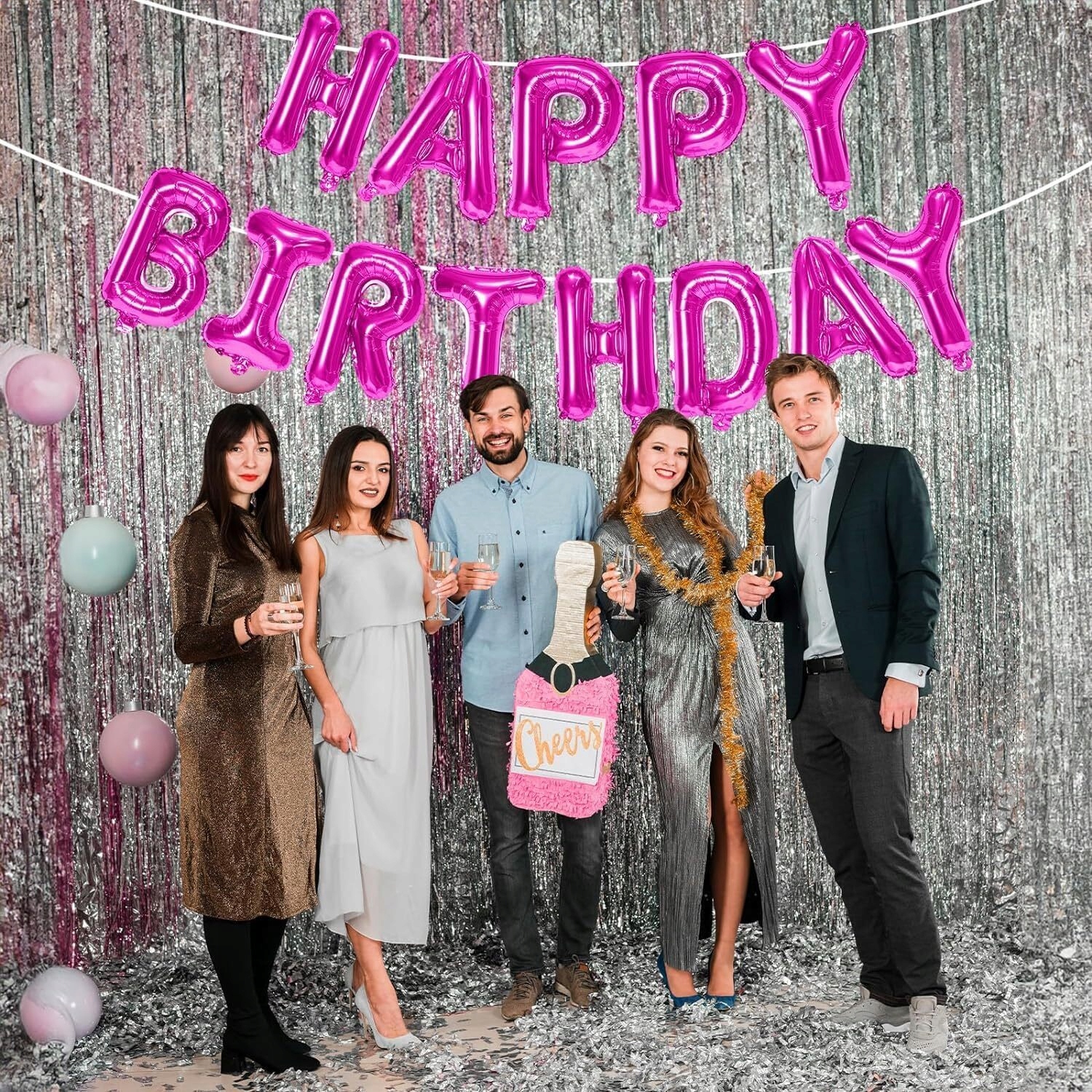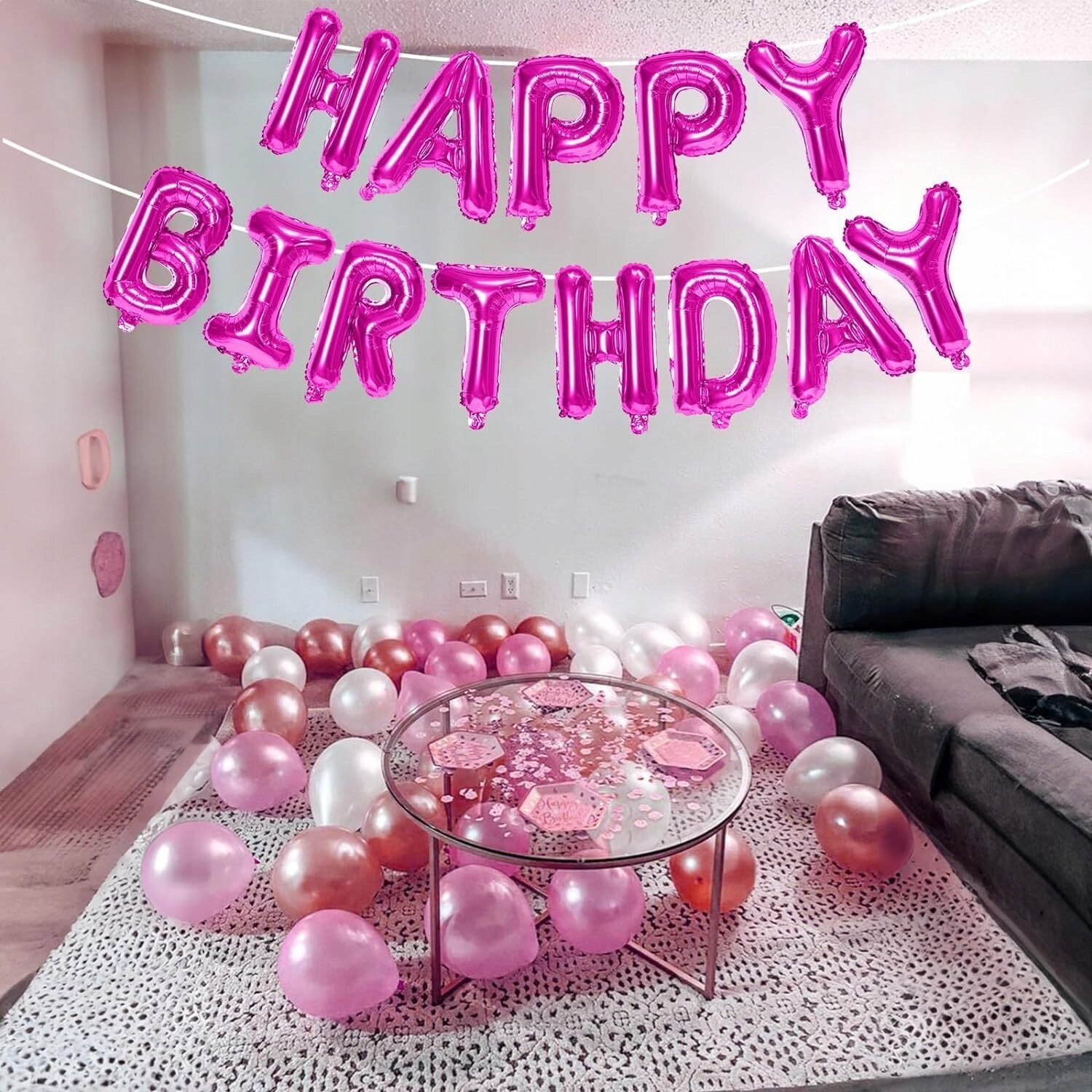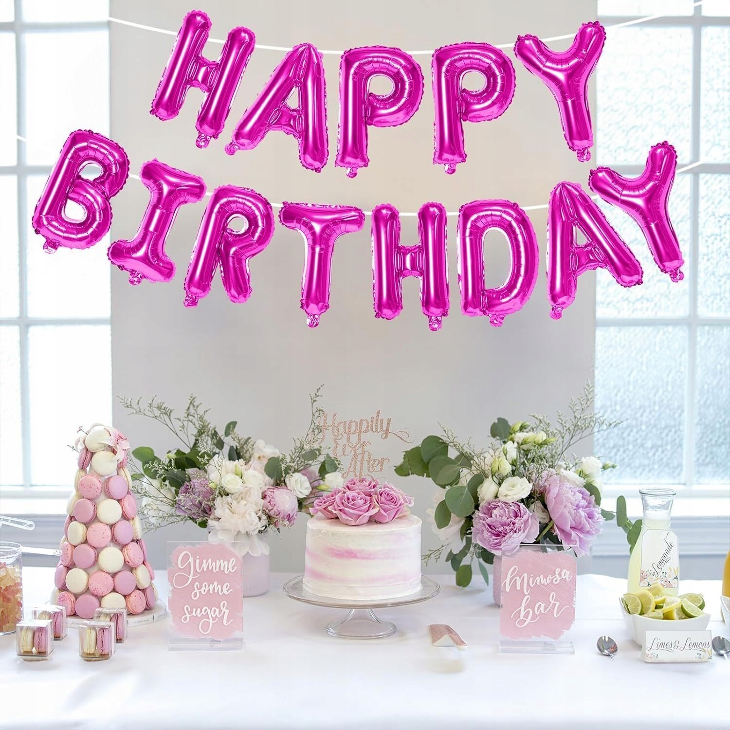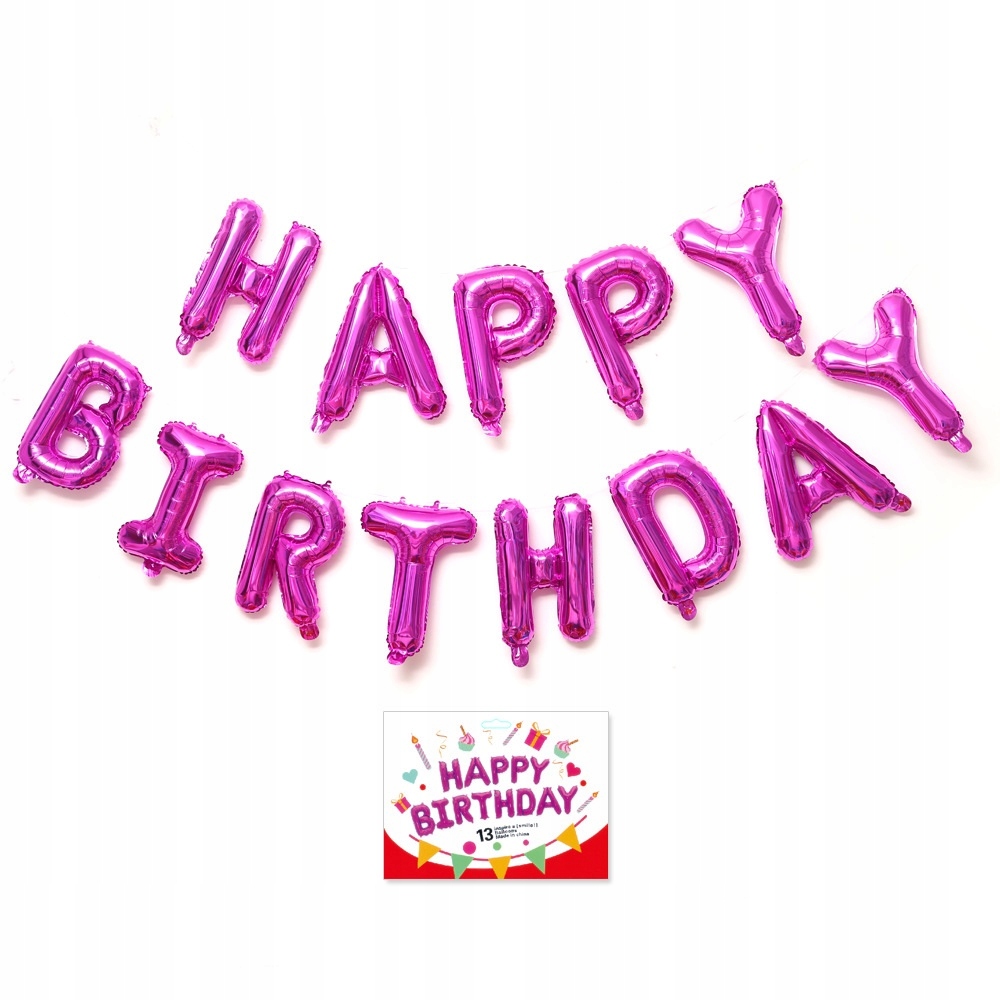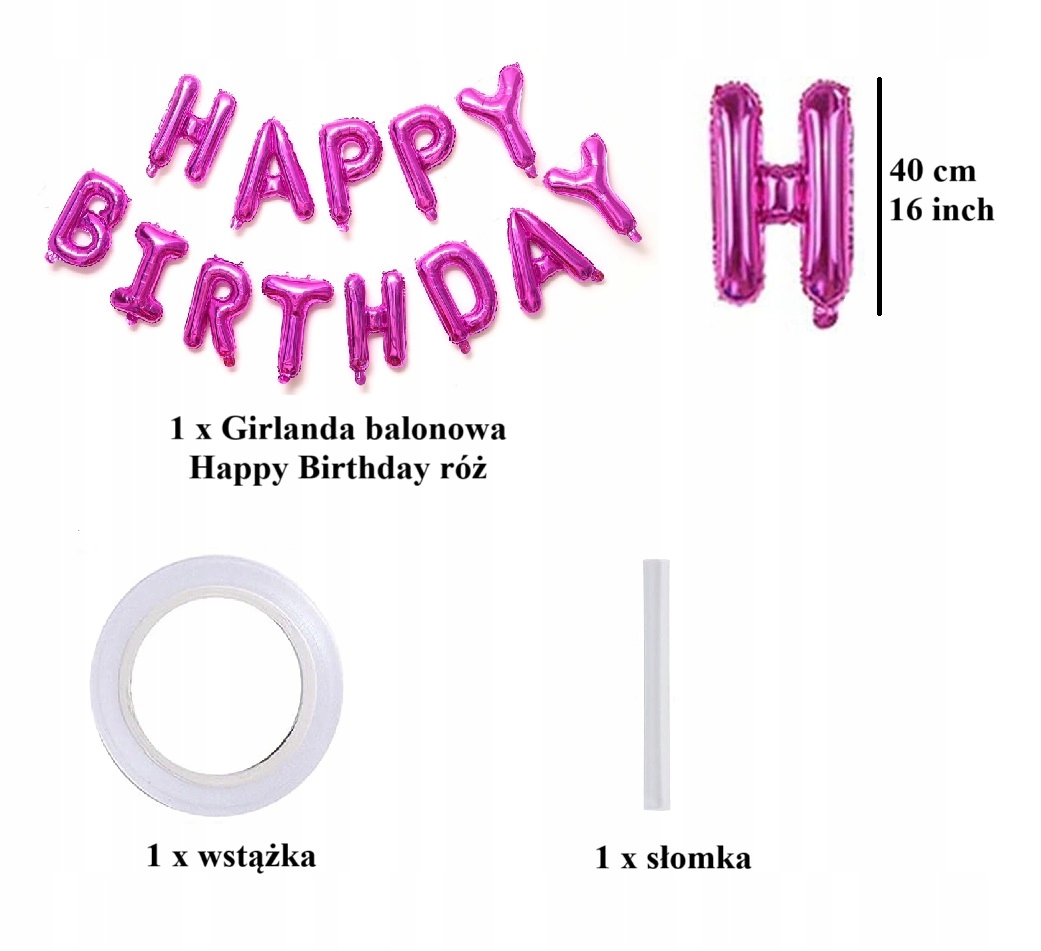 - 1 x balon foliowy napis Happy Birthday – kolor różowy, wysokość liter ok. 40 cm / 16 inch (każda litera osobny balon)