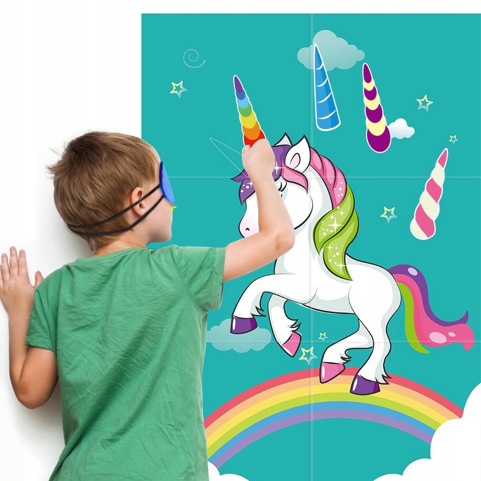 Dzieci zakładają maskę na oczy i próbują przypiąć papierowy róg jednorożca jak najbliżej odpowiedniego miejsca na plakacie. Świetna alternatywa dla klasycznego “Ośle, przypnij ogon” – w bajkowej, jednorożcowej wersji!