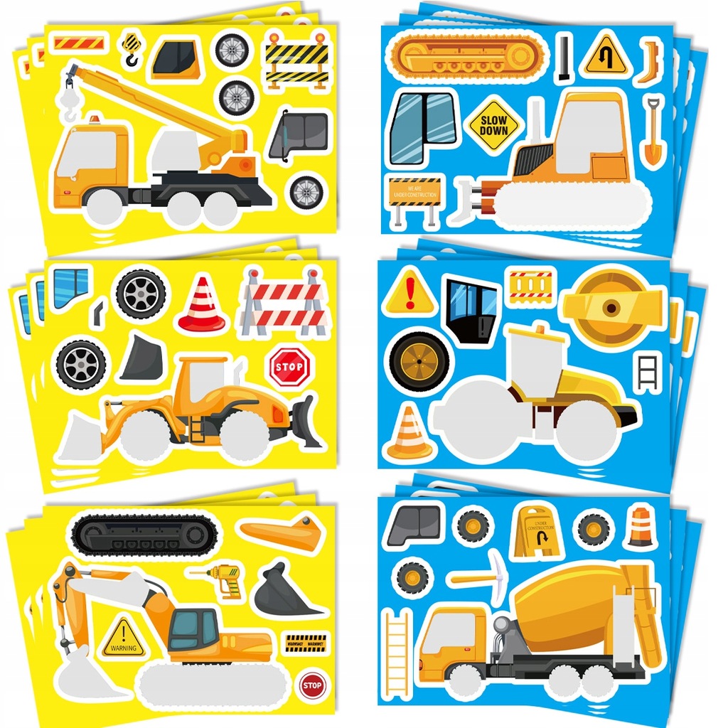 Kolorowy i kreatywny zestaw 6 arkuszy naklejek edukacyjnych z motywem budowlanym, stworzony z myślą o nauce przez zabawę. Idealny dla dzieci, które lubią kreatywne aktywności oraz prace DIY.