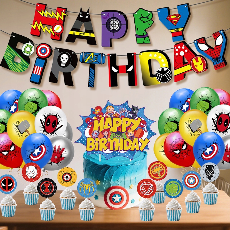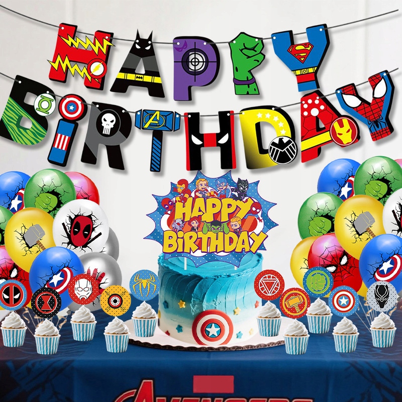 Oro Party Zestaw balonowych dekoracji urodzinowych Avengers Marvel + Girlanda + Topper na tort i Toppery na babeczki