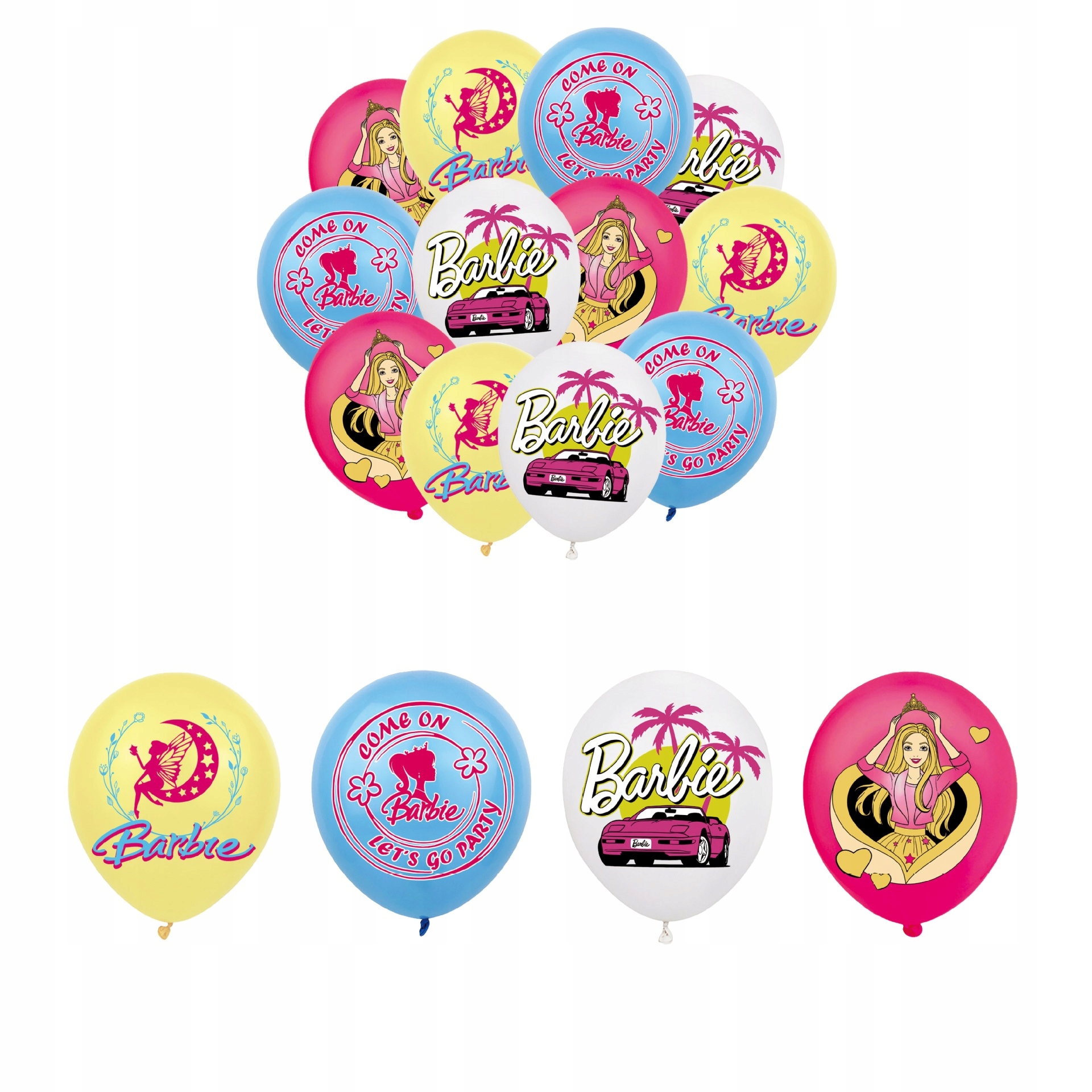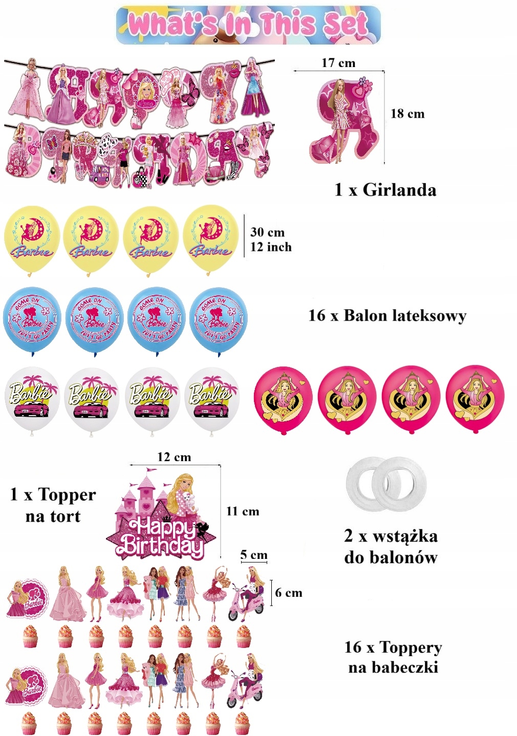 - 16 sztuk balonów lateksowych z nadrukami z motywem Barbie: