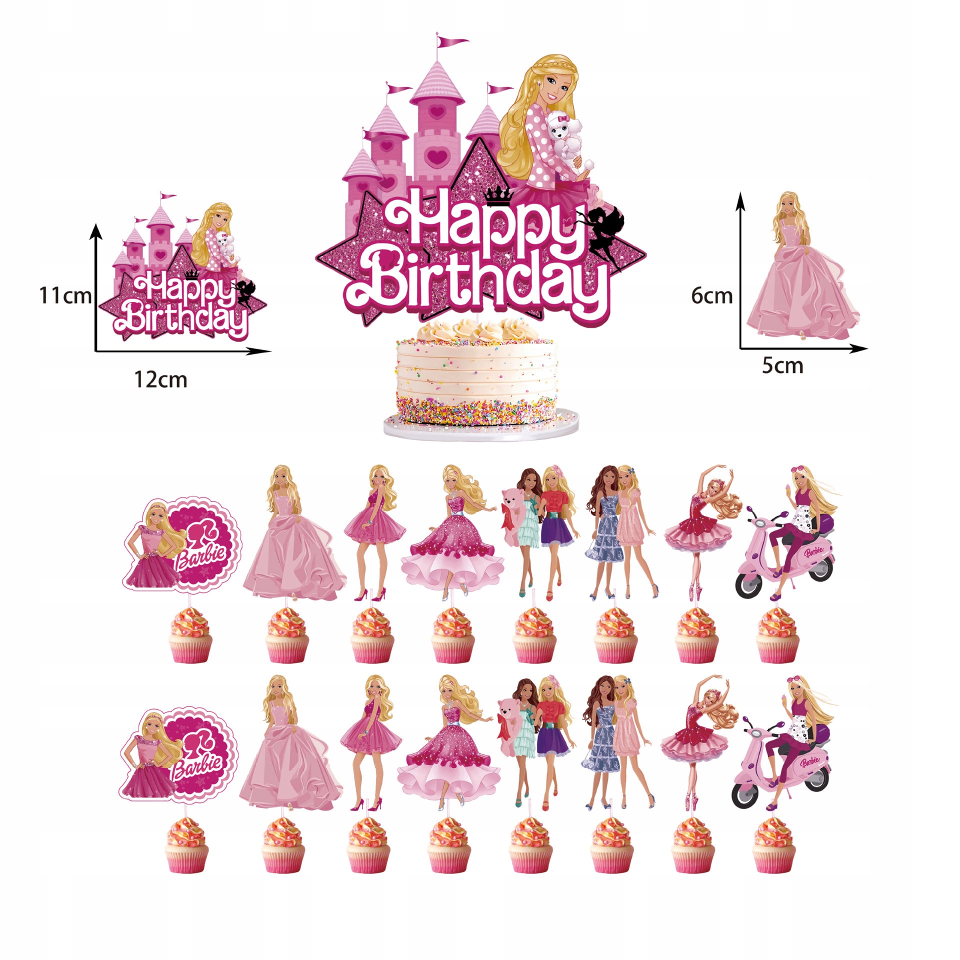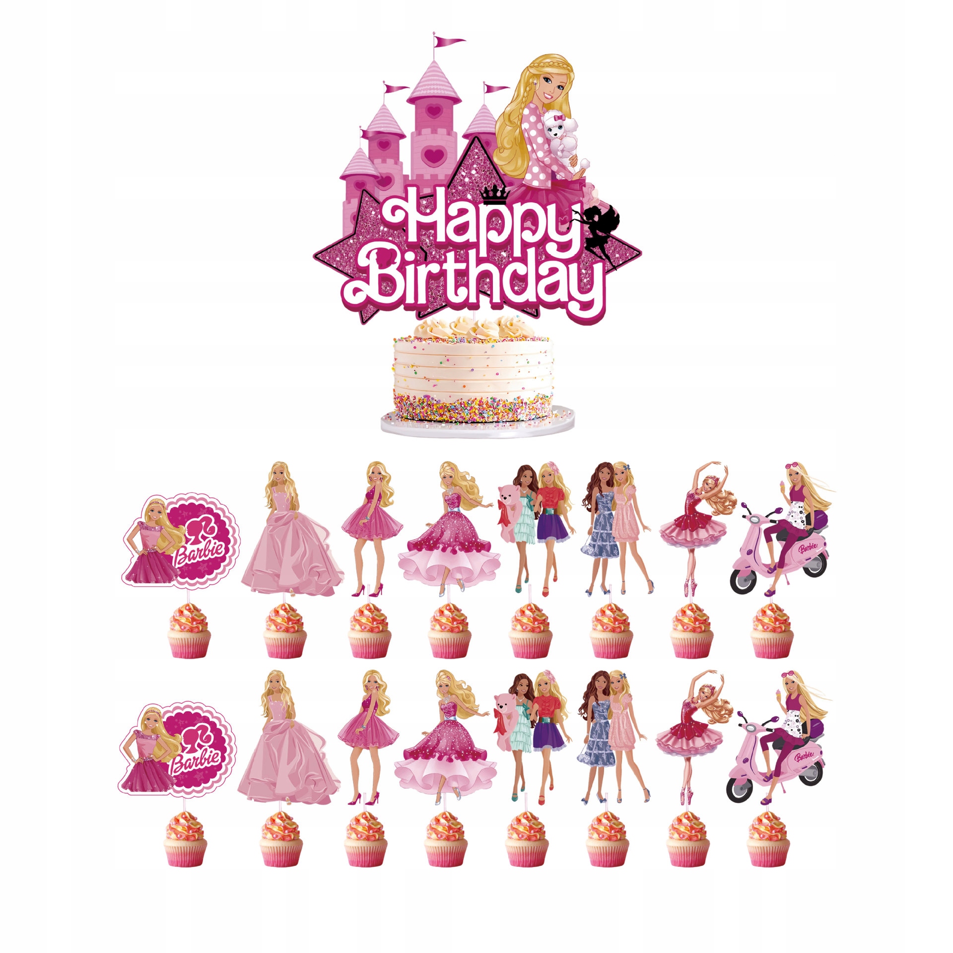 - 16 sztuk topperów na babeczki – motyw Barbie