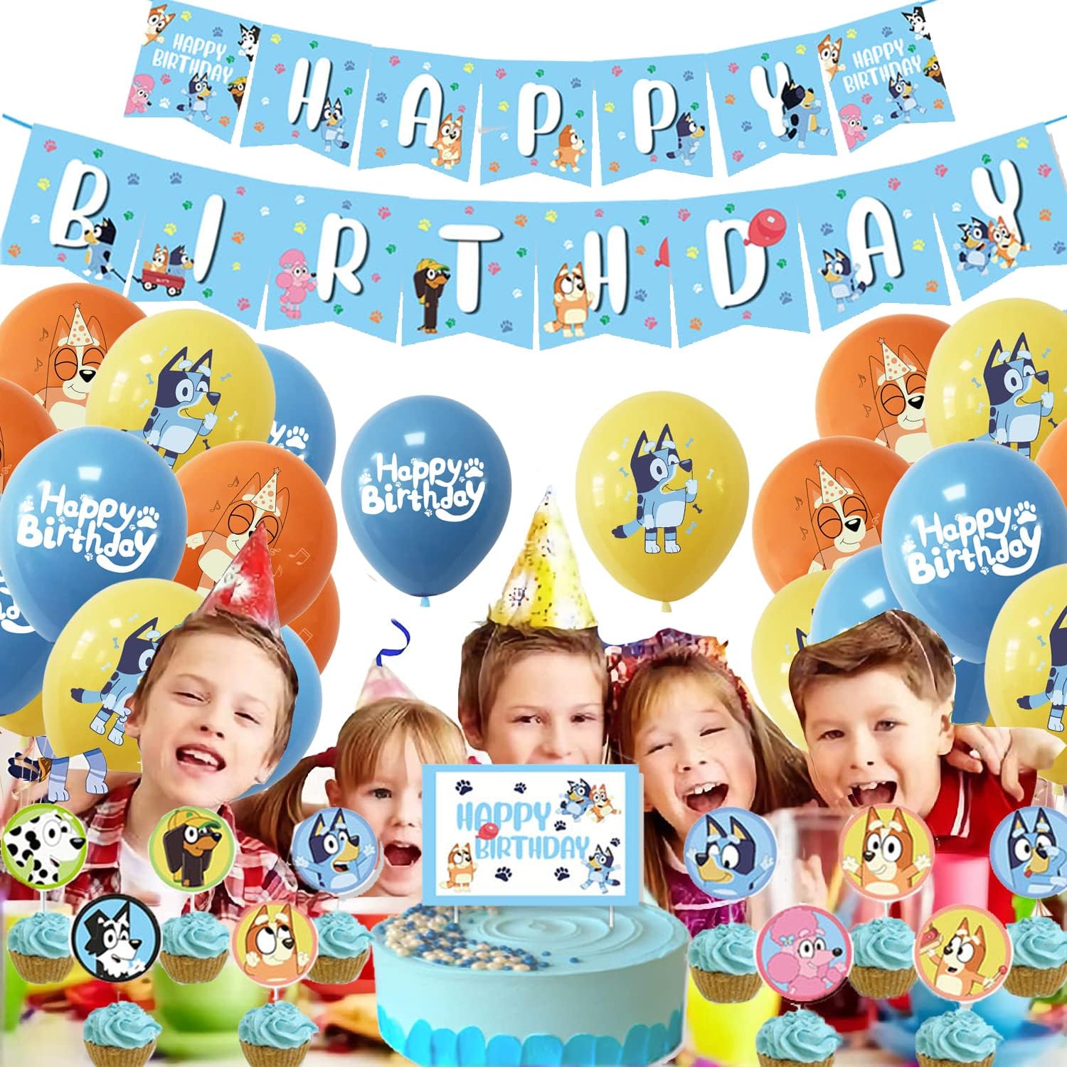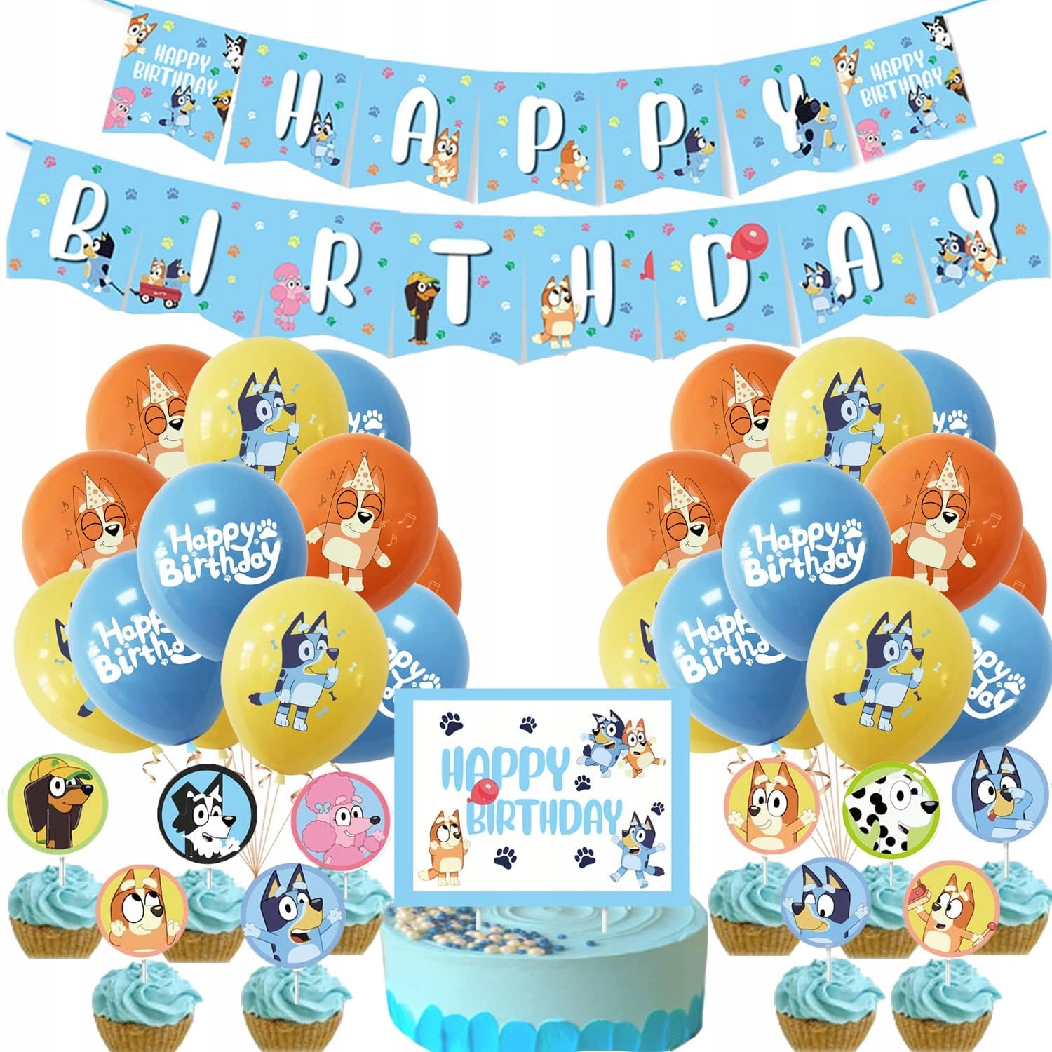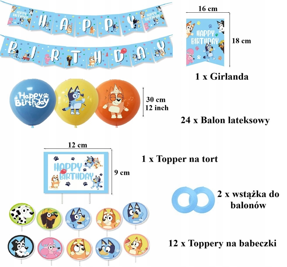 Oro Party Zestaw balonowych dekoracji urodzinowych Bluey Blue + Girlanda + Topper na tort i Toppery na babeczki