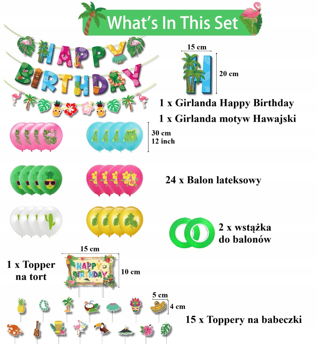 Oro Party – Zestaw Balonowych Dekoracji Urodzinowych Hawaii Lato Aloha Summer + 2 x Girlanda + Topper na Tort + Toppery na Babeczki