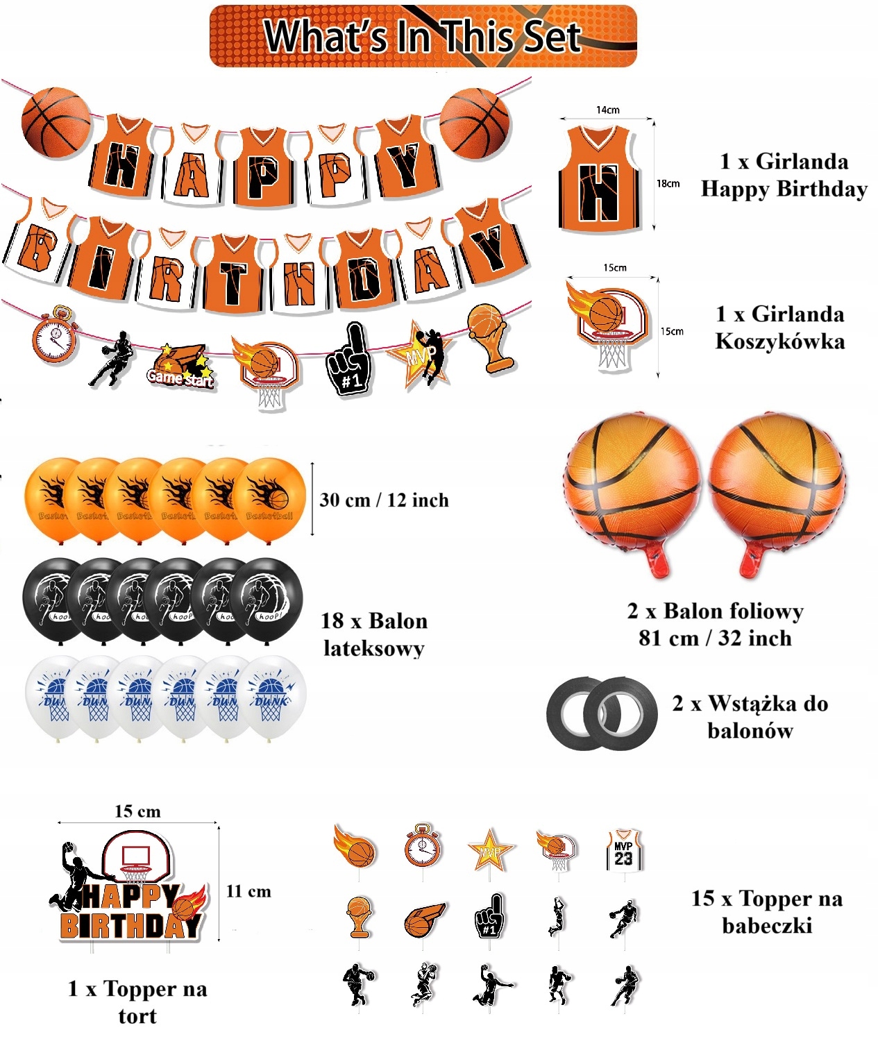 • 18 sztuk balonów lateksowych z nadrukiem koszykarskim 30 cm / 12″: