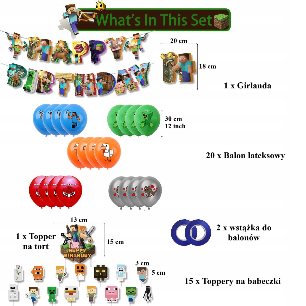 Oro Party Zestaw balonowych dekoracji urodzinowych Minecraft + Girlanda + Topper na tort i Toppery na babeczki