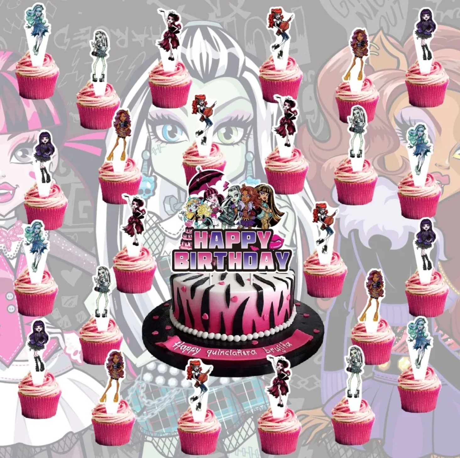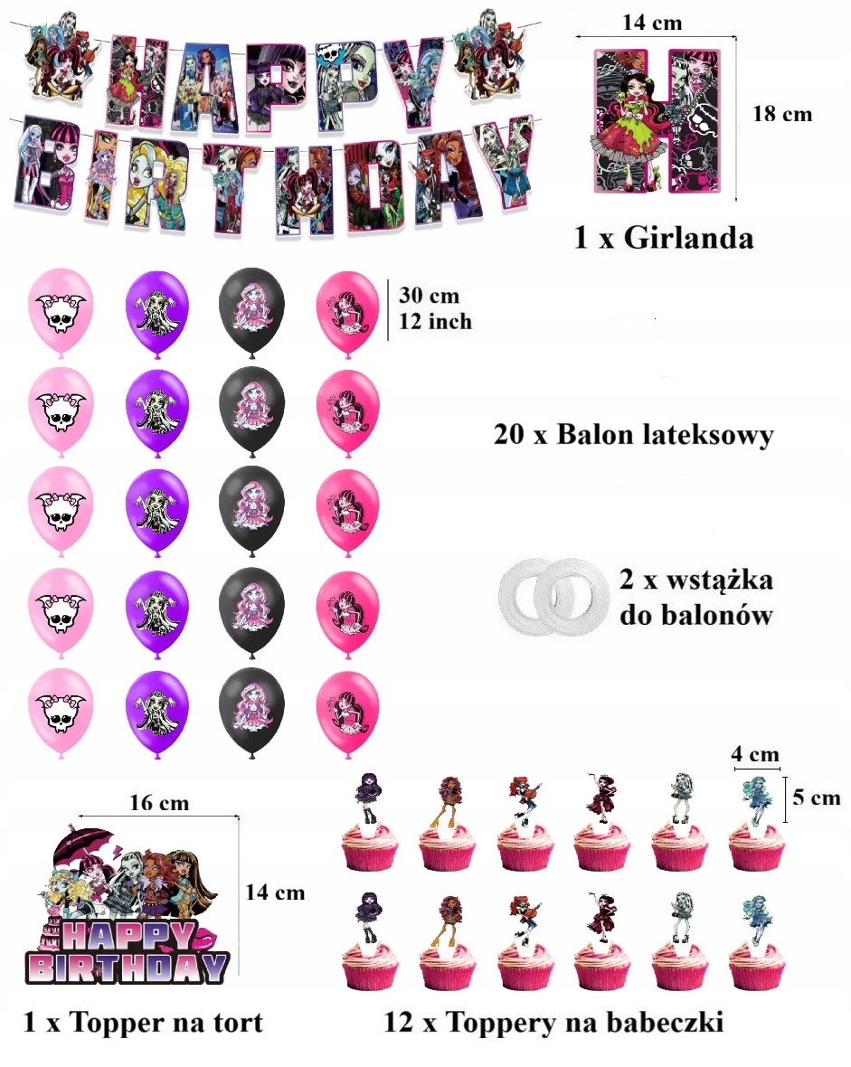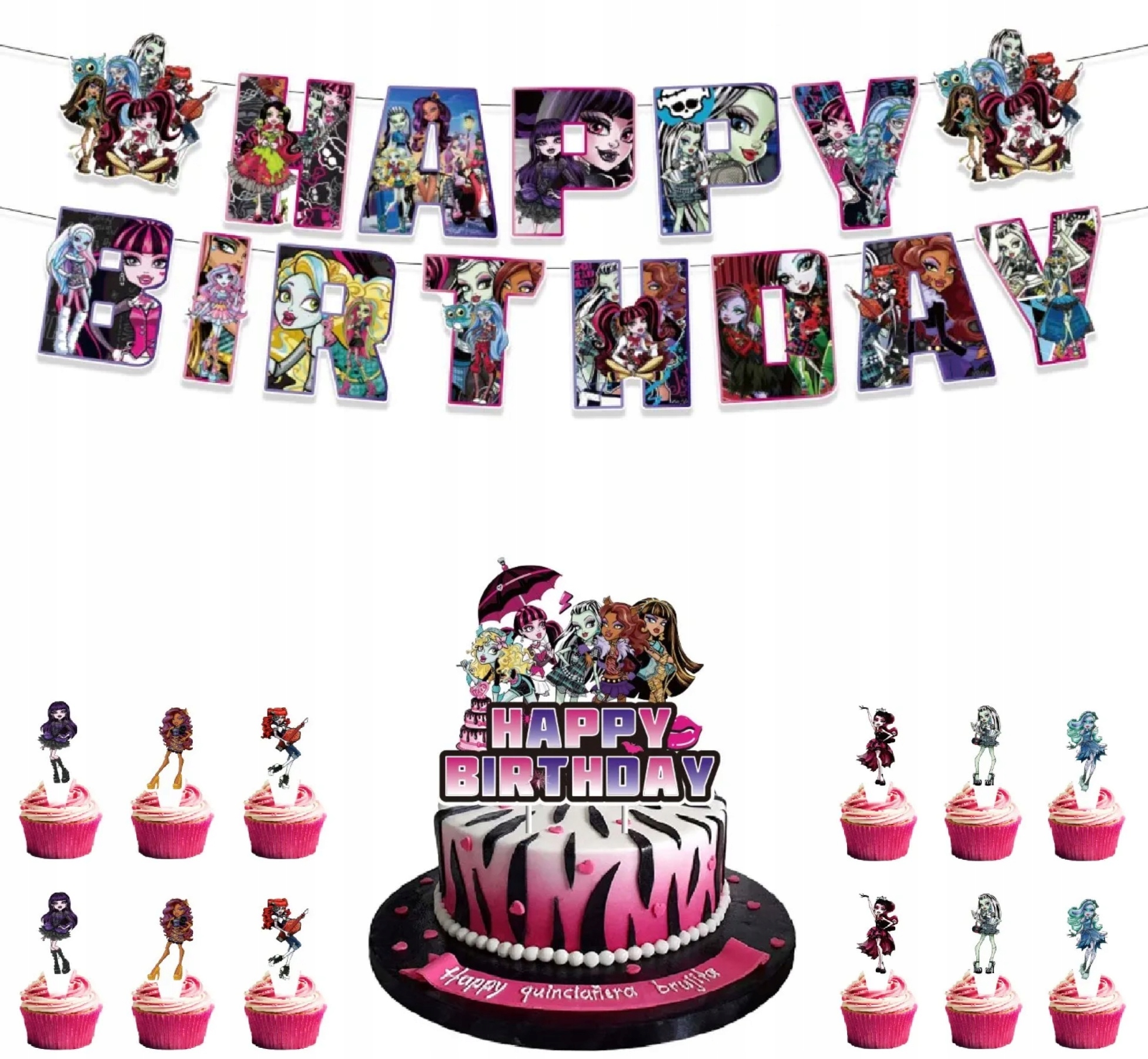 Oro Party Zestaw balonowych dekoracji urodzinowych Monster High + Girlanda + Topper na tort i Toppery na babeczki