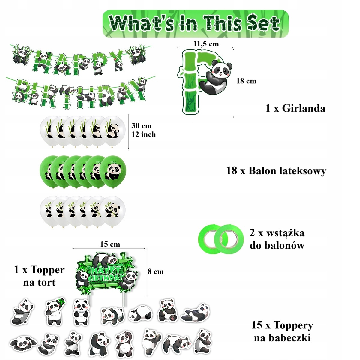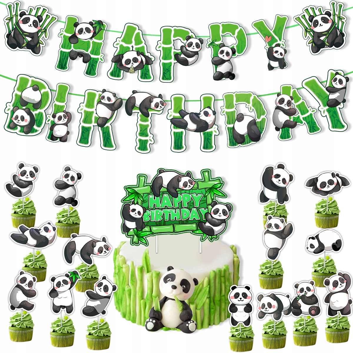 Zestaw balonowych dekoracji urodzinowych Panda + Girlanda + Toppery