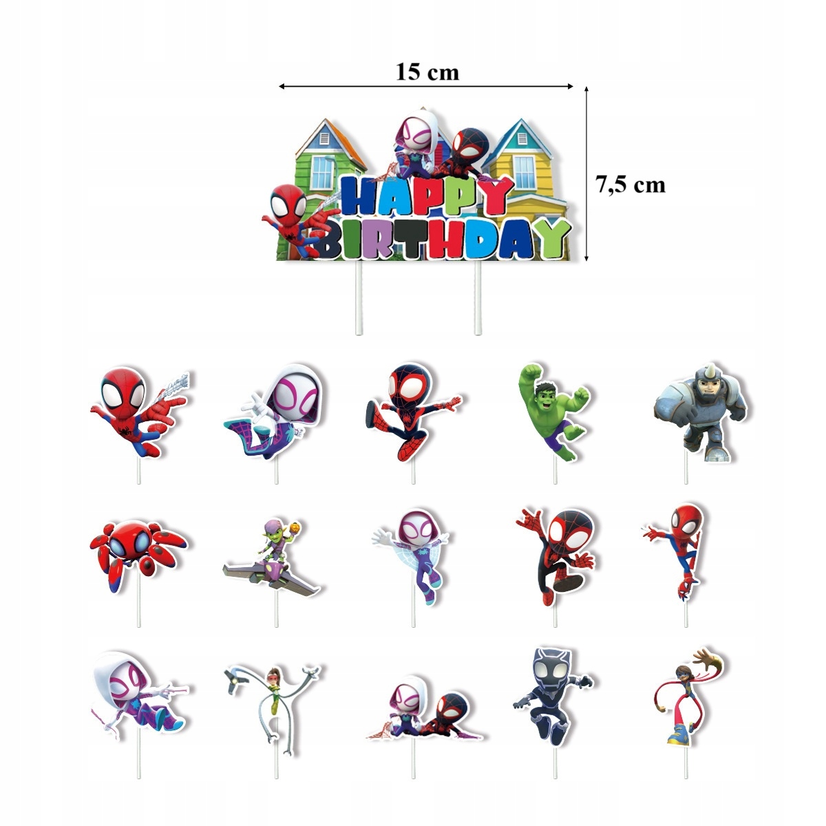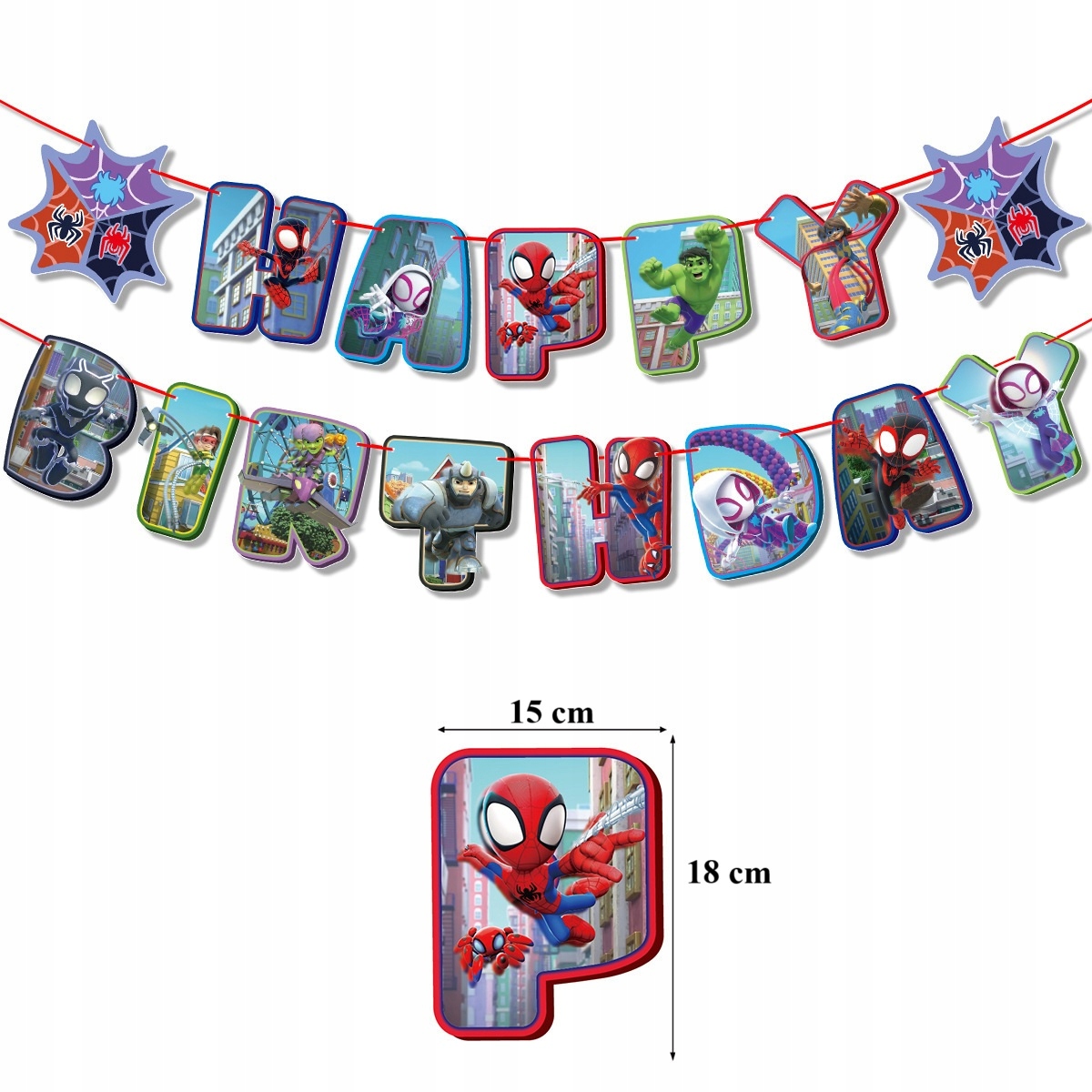 - 1 sztuka girlanda z napisem “Happy Birthday” – z motywami Spider Man Hulk
