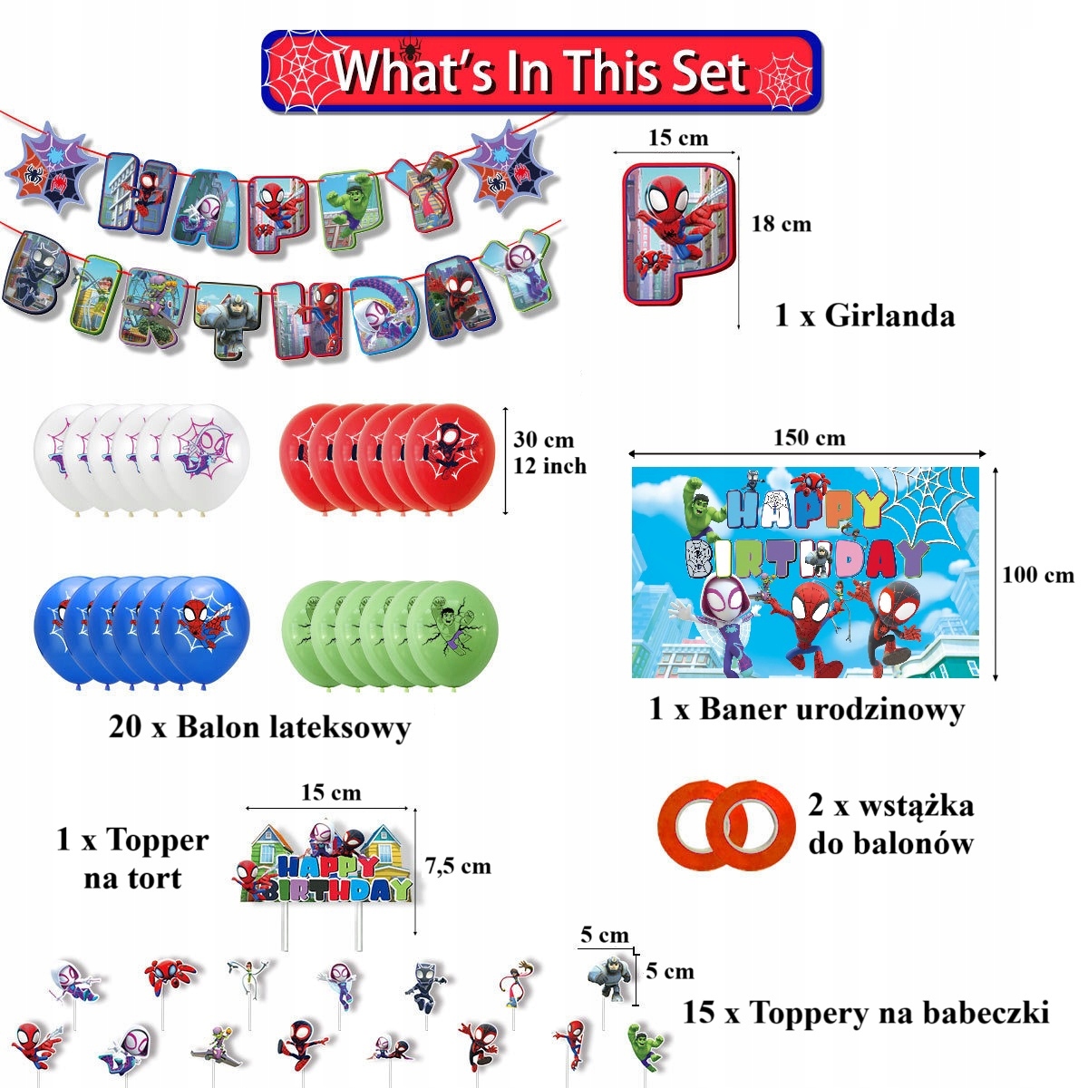 Oro Party Zestaw balonowych dekoracji urodzinowych Spider Man Hulk Spidey + Baner + Girlanda + Topper na tort i toppery na babeczki