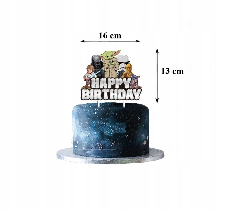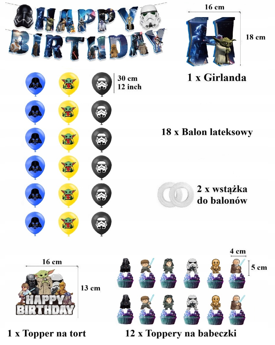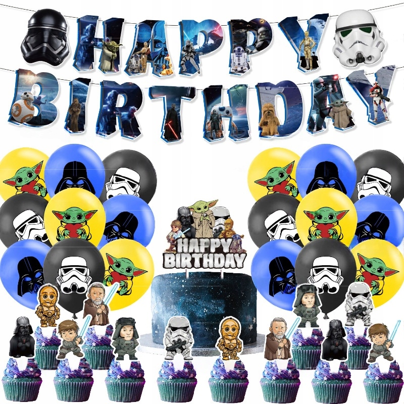 W komplecie znajdziesz balony z motywami Star Wars, efektowną girlandę urodzinową, a także topper na tort i toppery na babeczki – wszystko w klimacie kultowych postaci i symboli znanych z uniwersum Gwiezdnych Wojen.