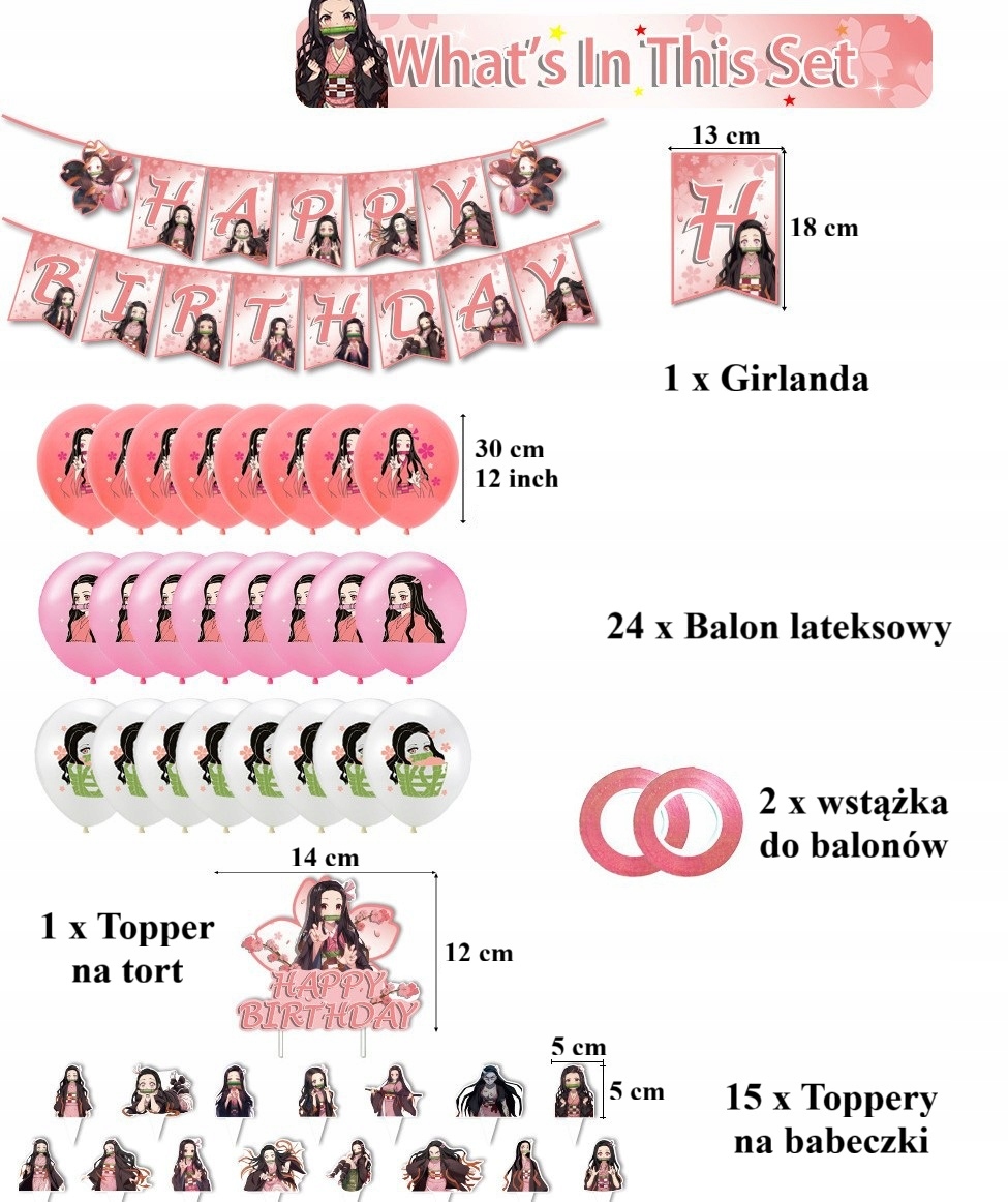 Stwórz niezapomniane przyjęcie urodzinowe w klimacie jednej z najpopularniejszych japońskich anime!  Ten wyjątkowy zestaw dekoracji inspirowany postacią Nezuko Kamado z serii Demon Slayer sprawi, że każda uroczystość nabierze magicznego, bajkowego charakteru.