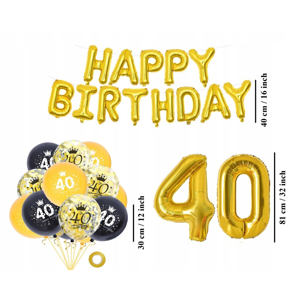 - 10 x balon lateksowy złoty z nadrukiem “40”, koroną i napisem “Happy Birthday” (30 cm / 12″)