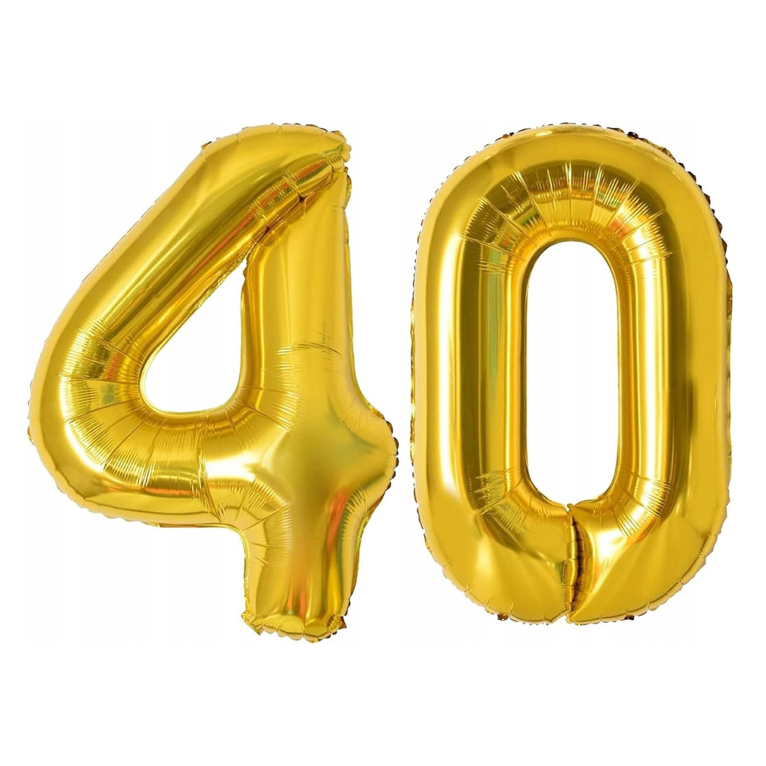 - 2 x duży balon foliowy – cyfry 4 i 0 w kolorze złotym (wysokość ok. 81 cm / 32″)