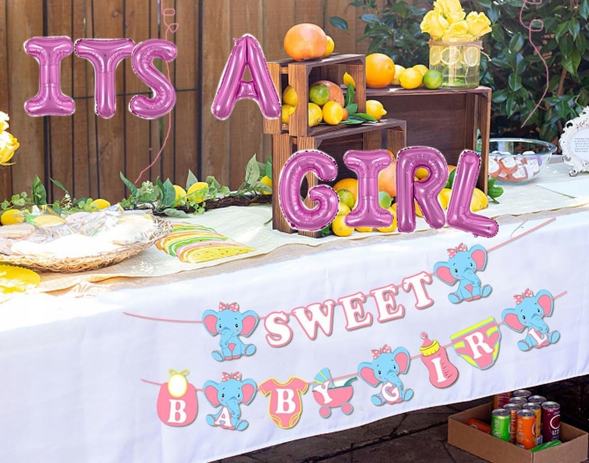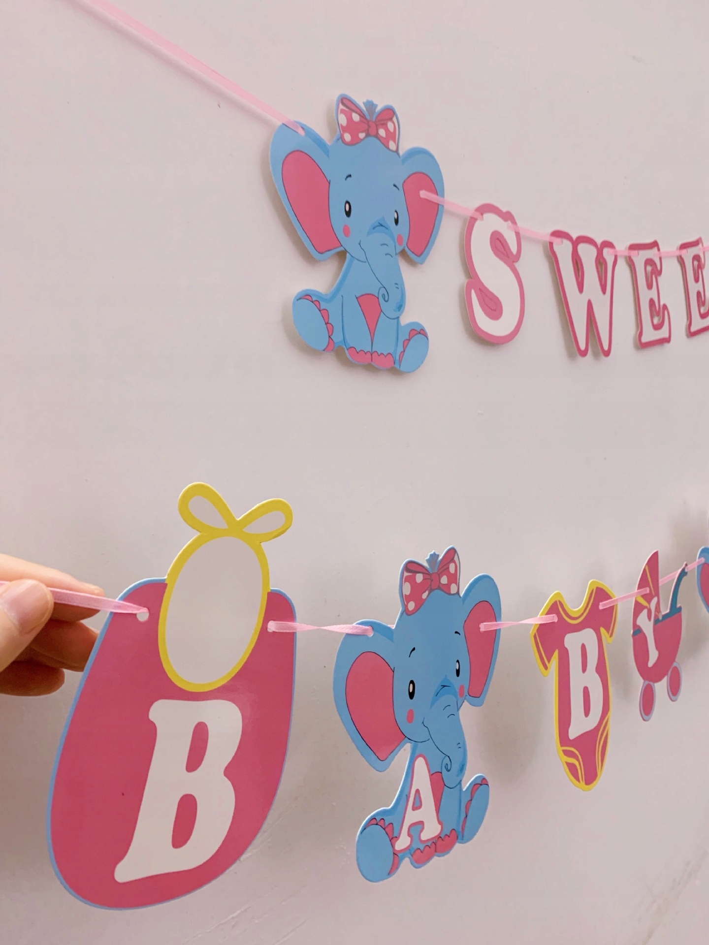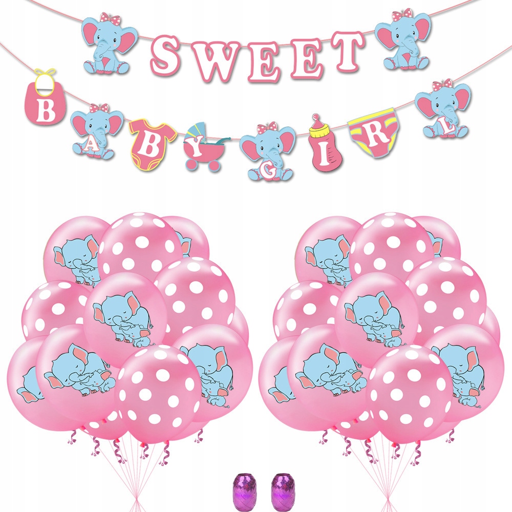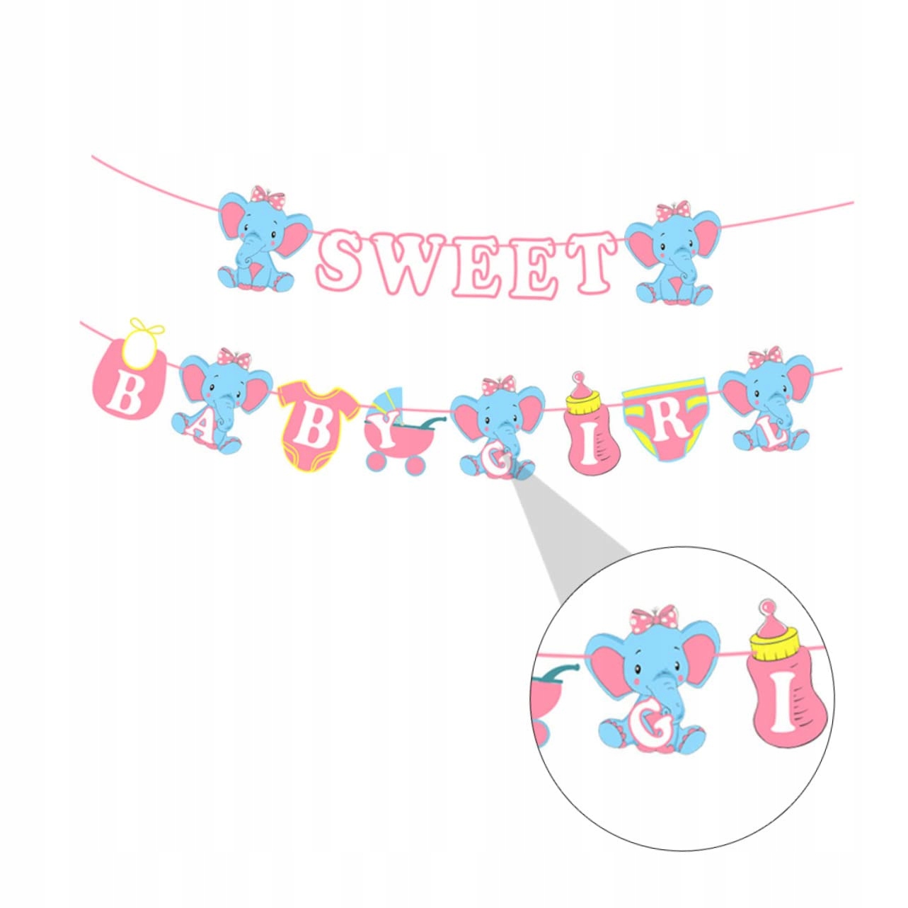 1 x papierowa girlanda z napisem Sweet Baby Girl – z ilustracjami niebieskich słoników na różowym tle