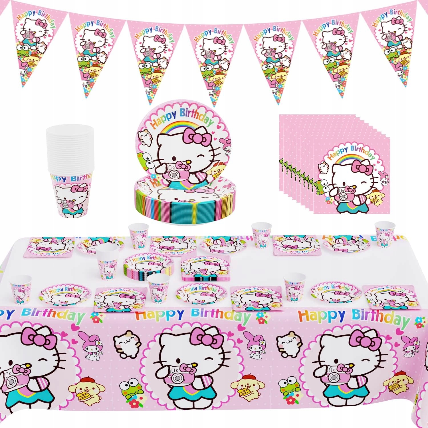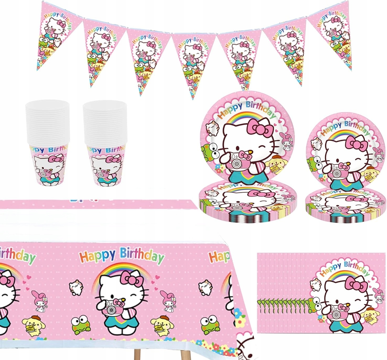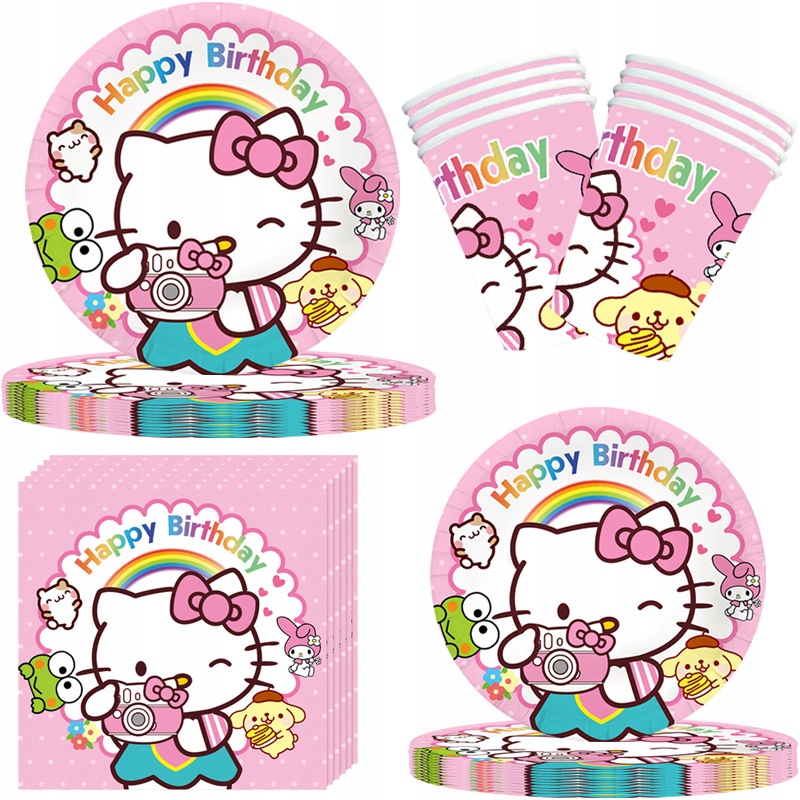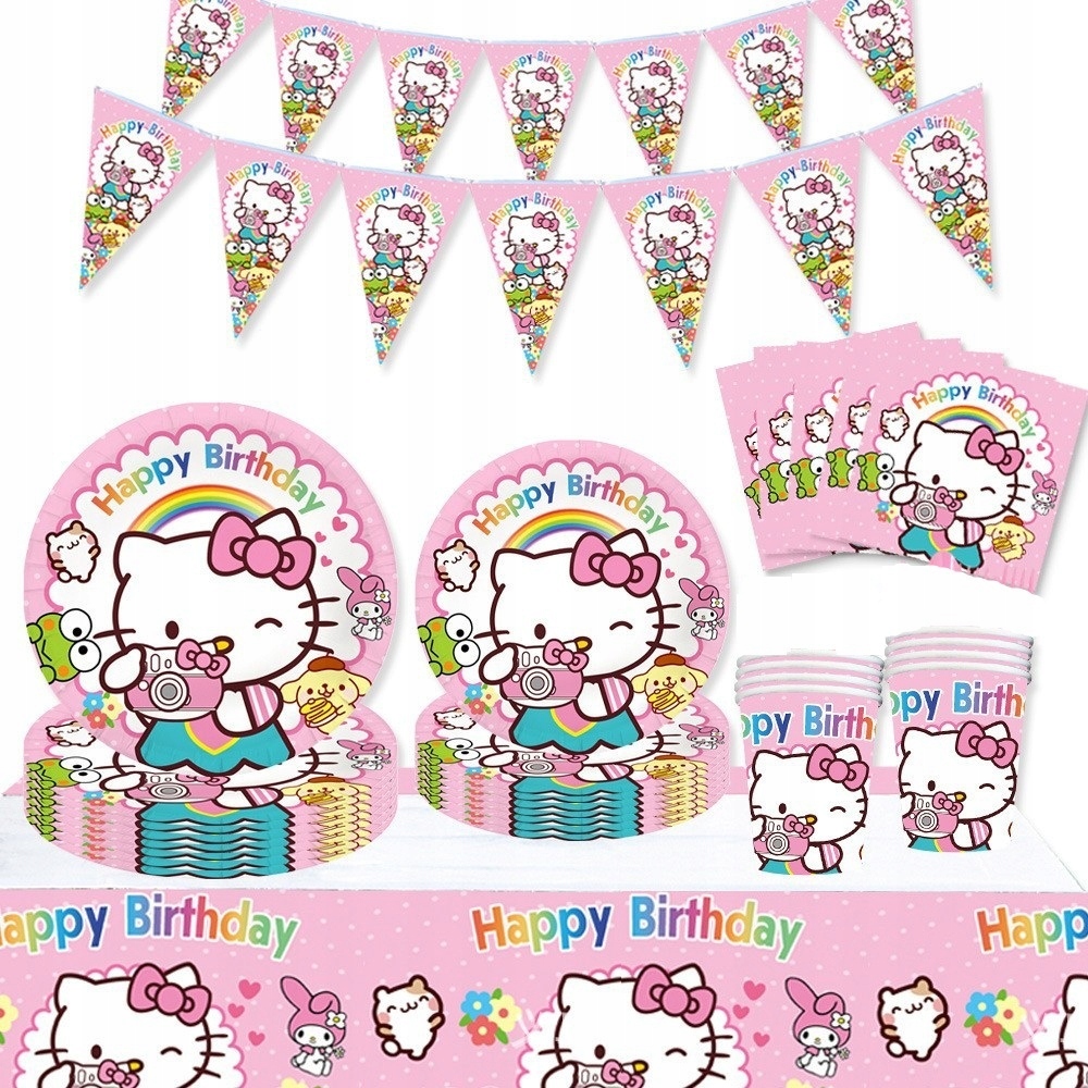 Zamień urodzinowe przyjęcie w słodką krainę Sanrio! Ten uroczy zestaw stołowy z motywem Hello Kitty to idealna oprawa dla fanów pastelowych kolorów, kawaii stylu oraz japońskich bohaterów. Kolorowe talerze, kubki, serwetki i obrus stworzą wyjątkowy klimat przygody, który zachwyci każdego fana Hello Kitty – małego i dużego!