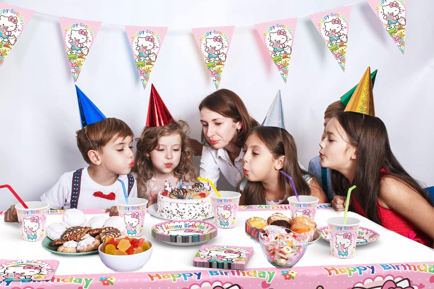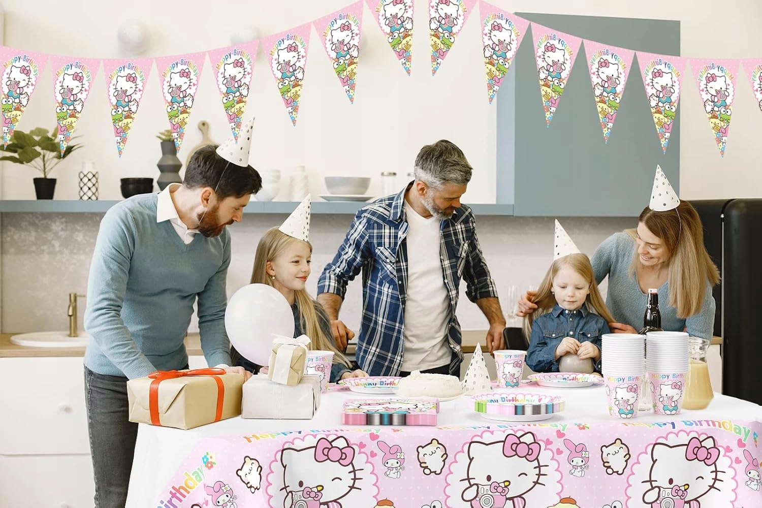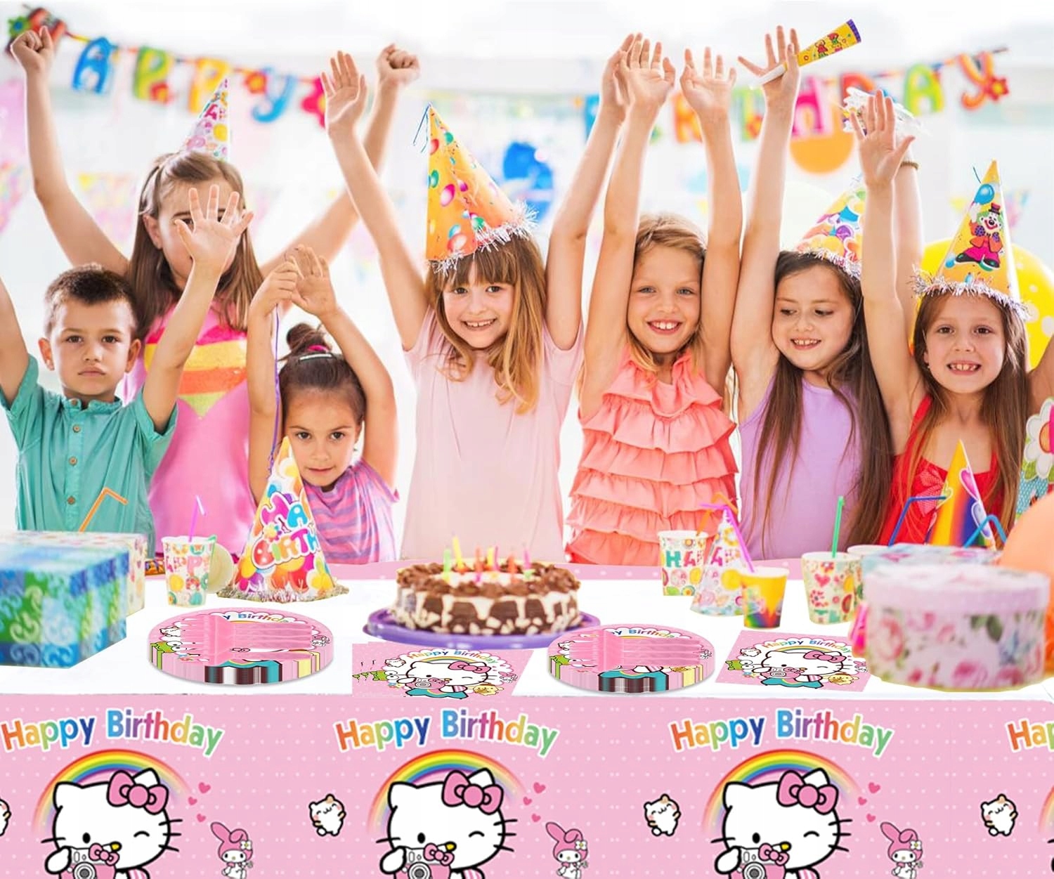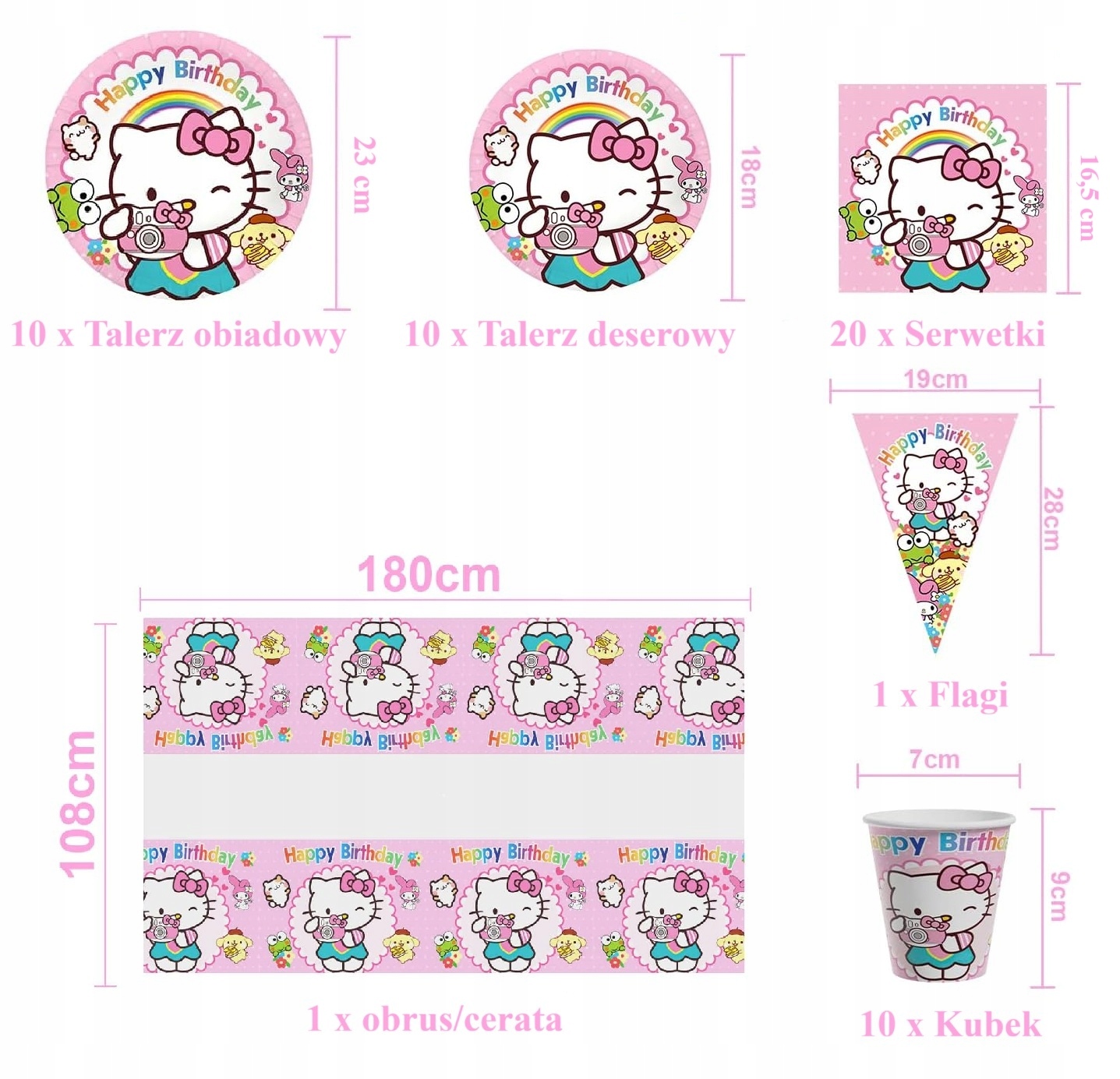 Zamień urodzinowe przyjęcie w słodką krainę Sanrio! Ten uroczy zestaw stołowy z motywem Hello Kitty to idealna oprawa dla fanów pastelowych kolorów, kawaii stylu oraz japońskich bohaterów. Kolorowe talerze, kubki, serwetki i obrus stworzą wyjątkowy klimat przygody, który zachwyci każdego fana Hello Kitty – małego i dużego!