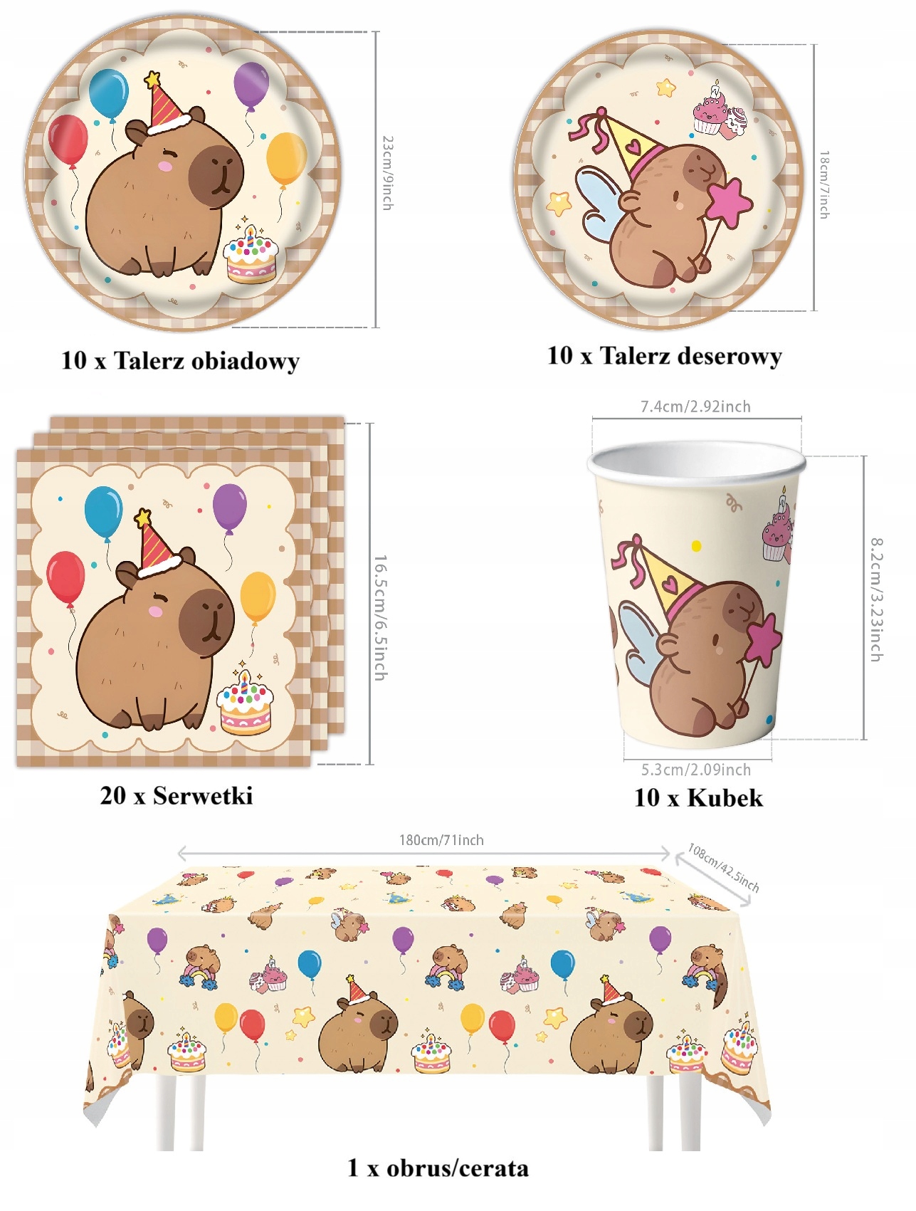 Uroczy zestaw dekoracji stołowych Kapibara od Oro Party to doskonały wybór dla wszystkich miłośników tych sympatycznych zwierzaków! Idealny na urodziny, przyjęcia tematyczne lub spotkania w gronie przyjaciół – wprowadzi do Twojego stołu przyjazną, radosną atmosferę i naturalny klimat. Kolorowe talerze, kubki, serwetki i obrus stworzą wyjątkowy klimat przygody, który zachwyci każdego fana Kapibar – małego i dużego!