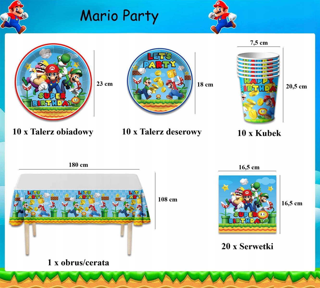 - 20 sztuk serwetek – z motywem Super Mario, praktyczne i dekoracyjne jednocześnie.