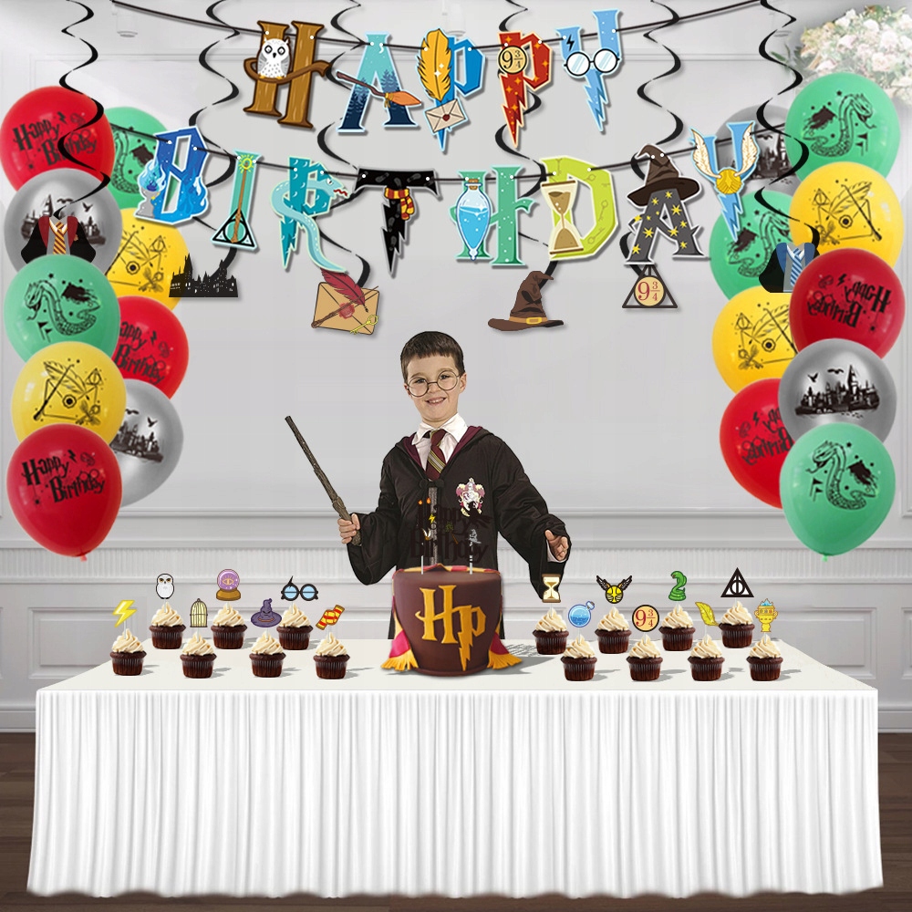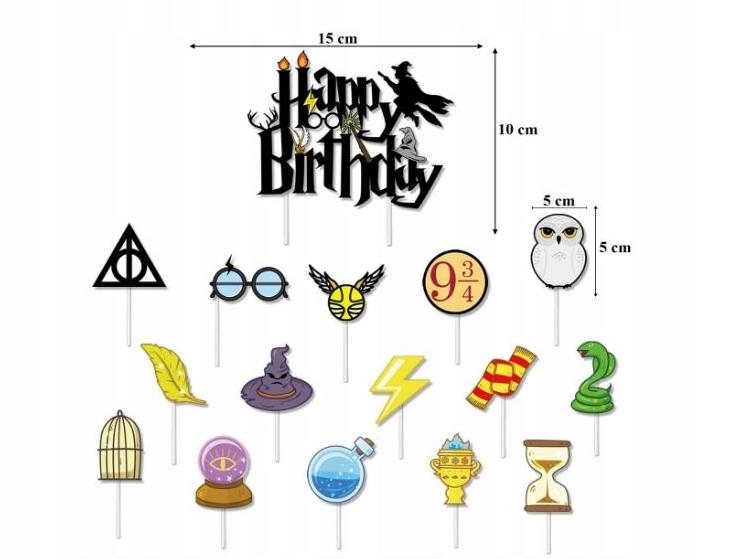 Dzięki ozdobom z charakterystycznymi symbolami (różdżki, Hogwart, Bazyliszek, napisy Happy Birthday) Twoje przyjęcie zyska niezapomniany klimat rodem z Wielkiej Sali!