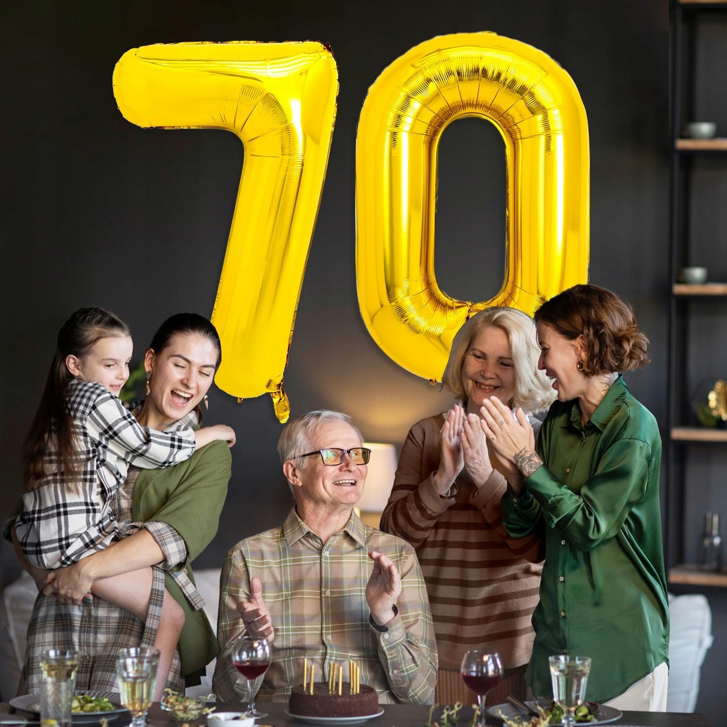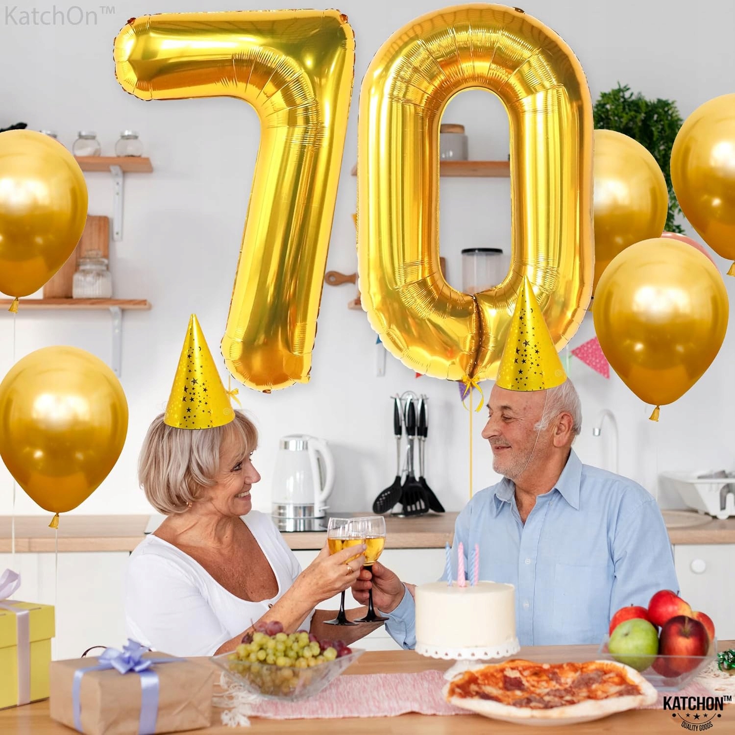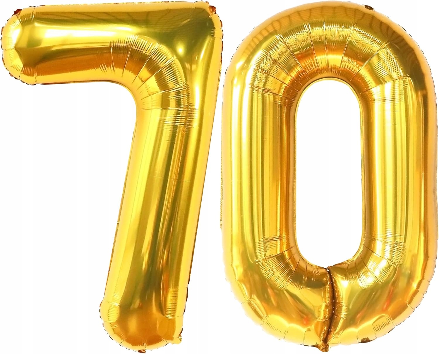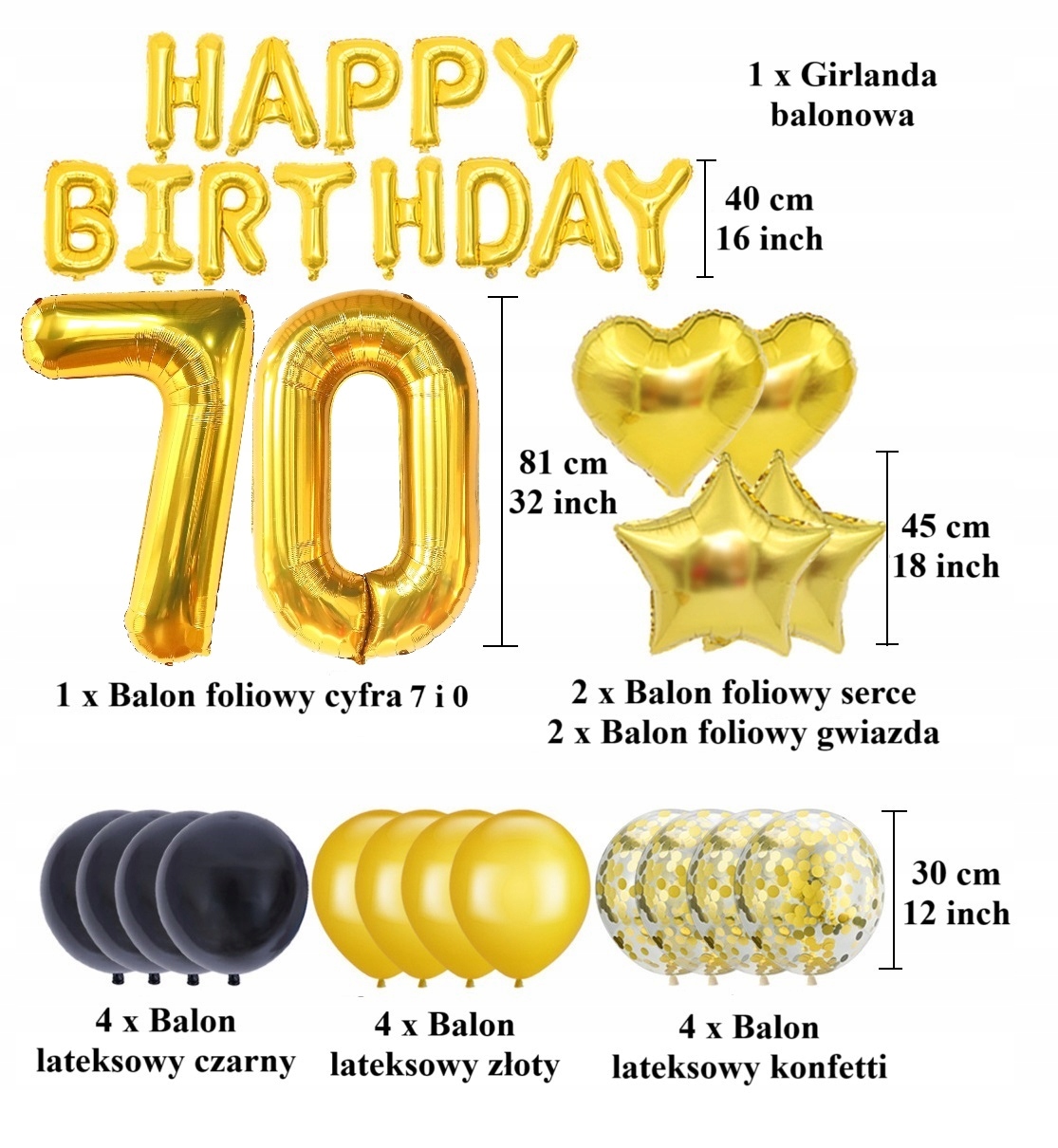 - 2 x duży balon foliowy – cyfry 7 i 0 w kolorze złotym (wysokość ok. 81 cm / 32″)