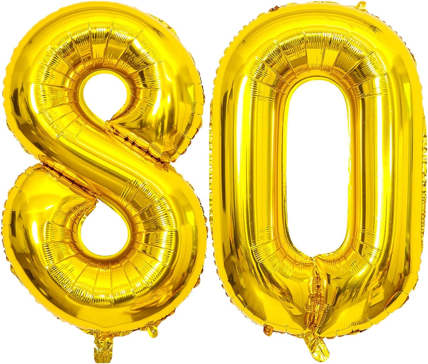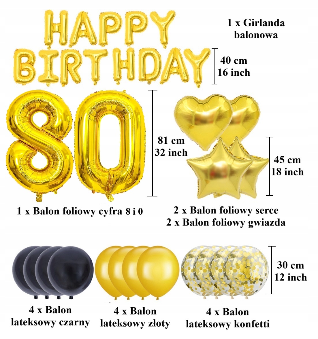 - 2 x duży balon foliowy – cyfry 8 i 0 w kolorze złotym (wysokość ok. 81 cm / 32″)