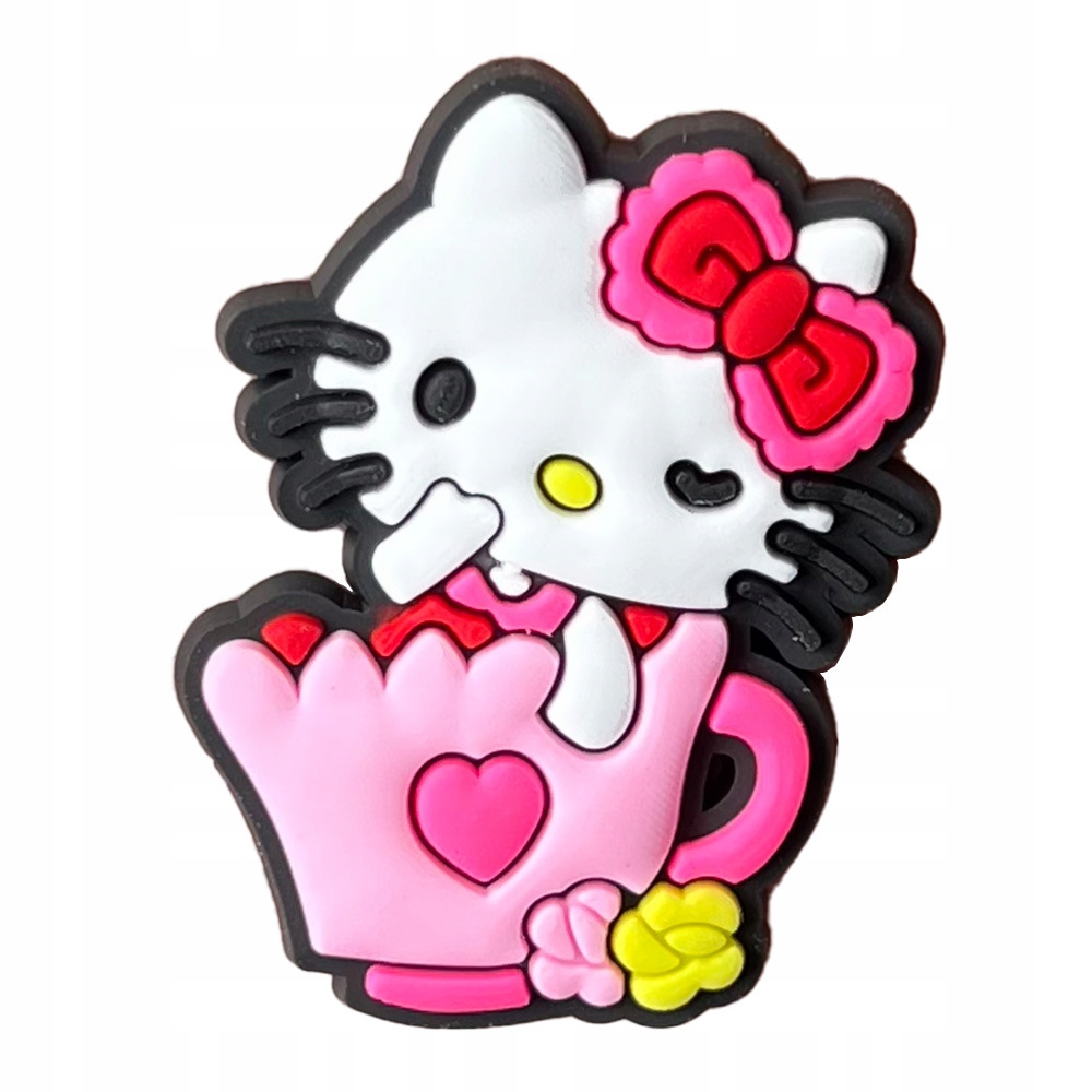 Przypinka Filiżanka Hello Kitty do Crocs. Wykonana z trwałego PVC i żywicy, łatwa do przypięcia, idealna dla fanek kreatywności.
