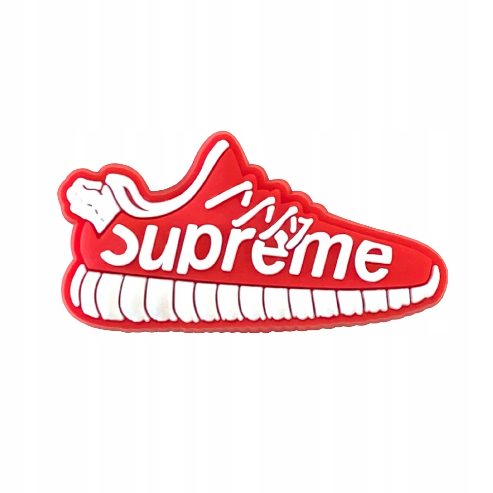 Przypinka Supreme do Crocs. Wykonana z trwałego PVC i żywicy, łatwa do przypięcia, idealna dla fanek kreatywności.