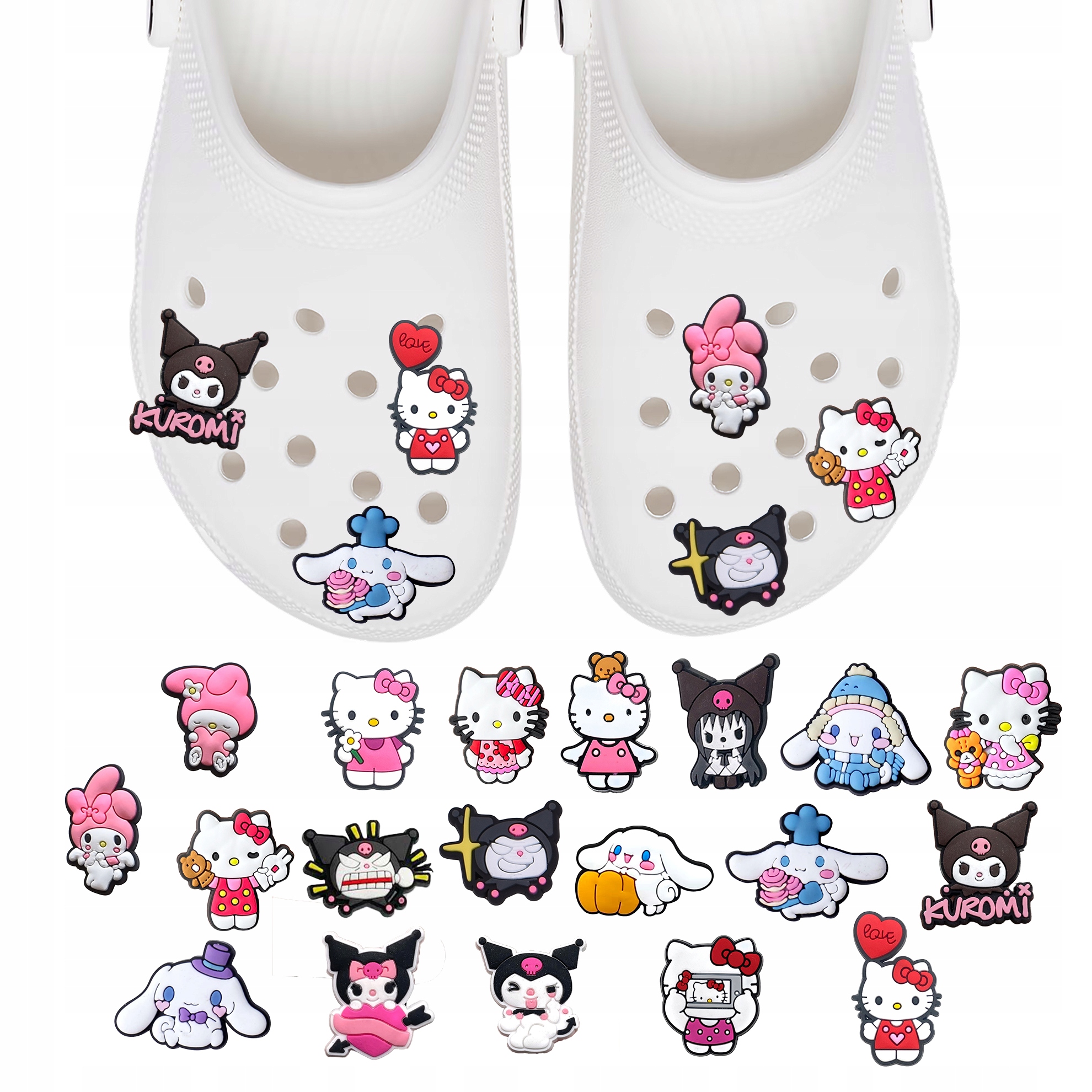Przypinki do Crocs HELLO KITTY zestaw 19 sztuk. Doskonały wybór na urodziny, imprezy, Boże Narodzenie, Wielkanoc, czy dzień dziecka!