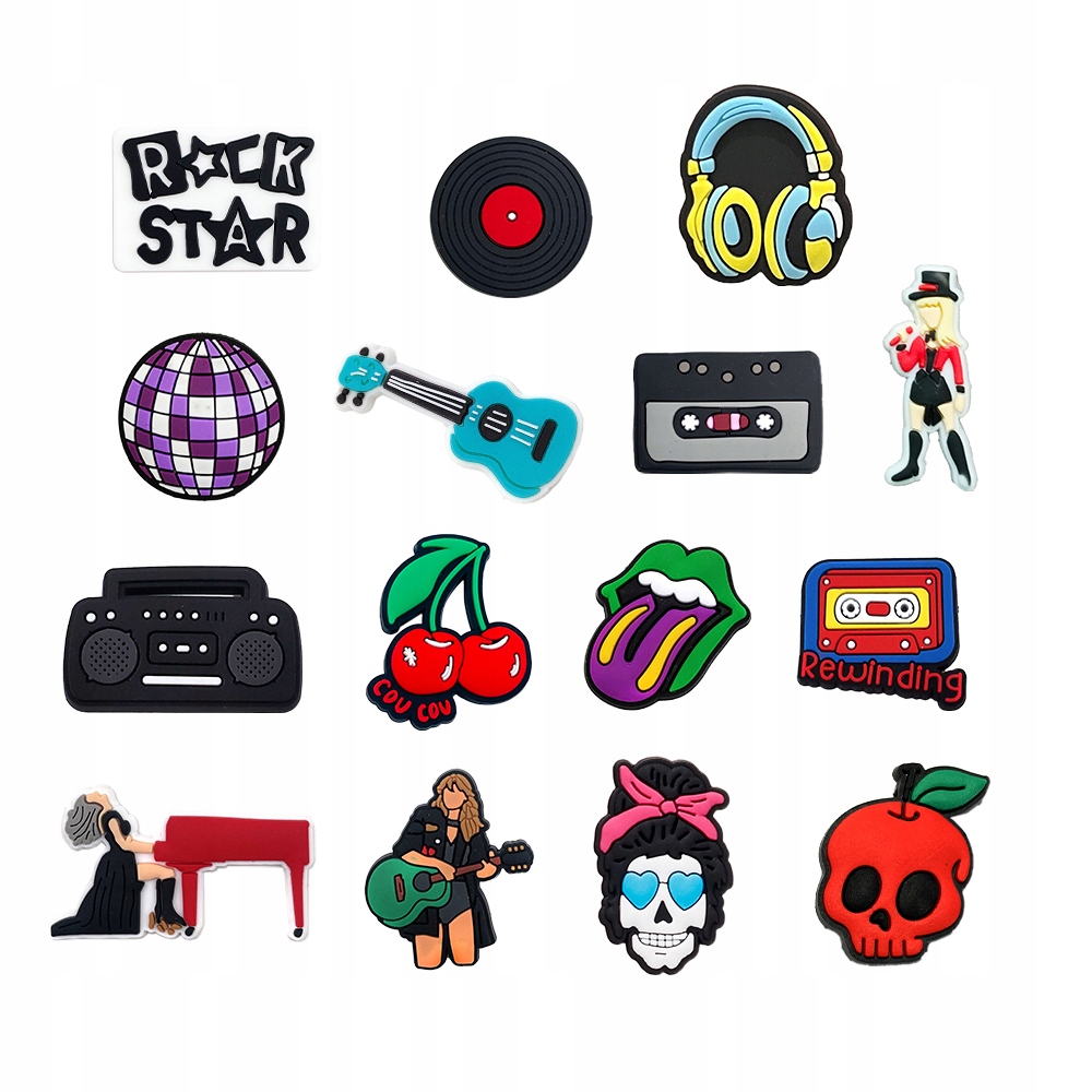 Przypinki do Crocs MUZYKA MUSIC ROCK zestaw 15 sztuk! Wykonane z trwałego PVC i żywicy, te kolorowe i zabawne dekoracje odmienią wygląd Twoich butów, nadając im wyjątkowy, muzyczny charakter.