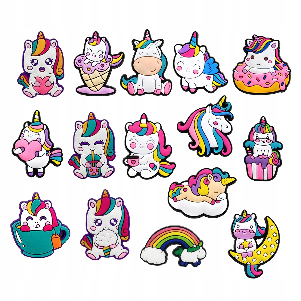Szukasz pomysłowych ozdób do swoich butów? Przypinki do Crocs UNICORN JEDNOROŻEC zestaw 15 sztuk to idealne rozwiązanie! Wykonane z PVC, te urocze dekoracje dodadzą uroku Twoim butom, nadając im unikalny i zabawny wygląd.