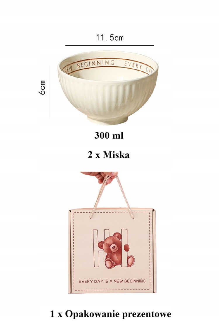 Elegancki zestaw 2 misek ceramicznych z Misiem to doskonałe połączenie estetyki, funkcjonalności i jakości wykonania. Każda miseczka ozdobiona jest subtelnym napisem Every day is a new beginning (Każdy dzień jest nowym początkiem).