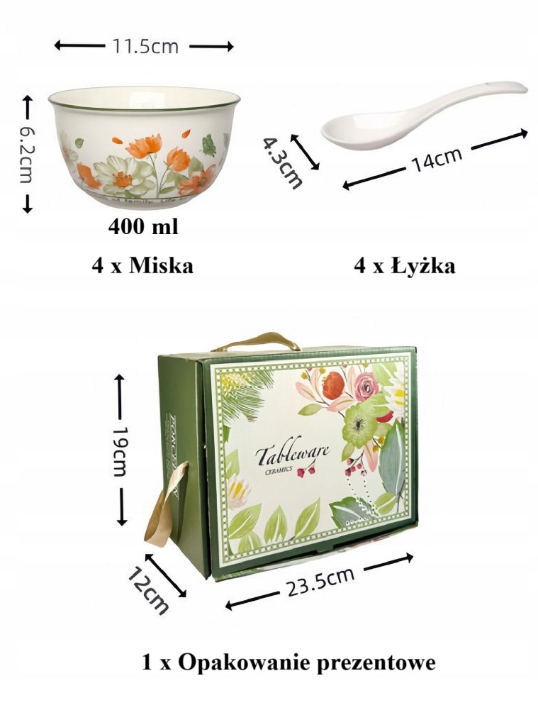 - Zawartość zestawu: 4 sztuki misek + 4 sztuki łyżek ceramicznych