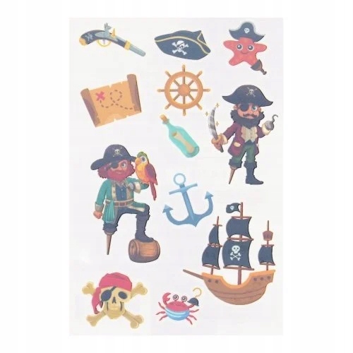 Tatuaż Zmywalny Piraci od STICKER BOO – 11 wzorów na arkuszu, łatwe do nakładania i usuwania. Kreatywna zabawa dla dzieci, idealne na każdą okazję!
