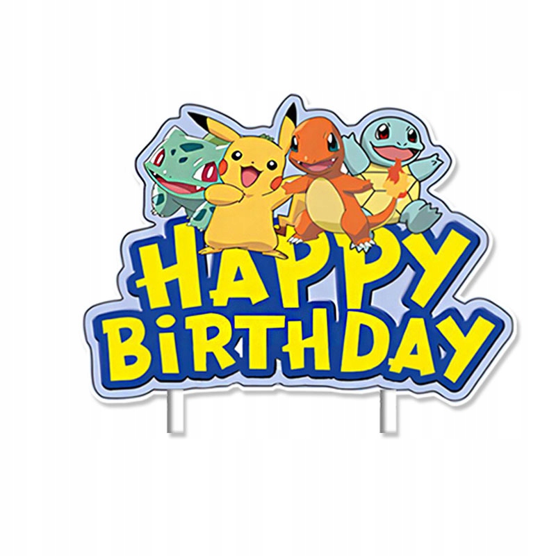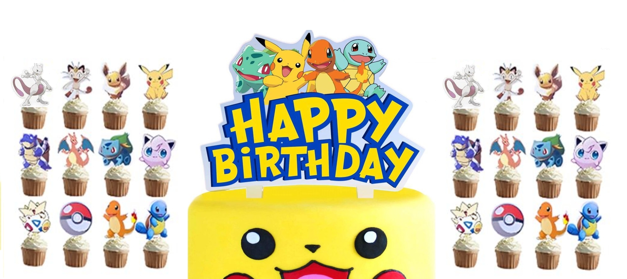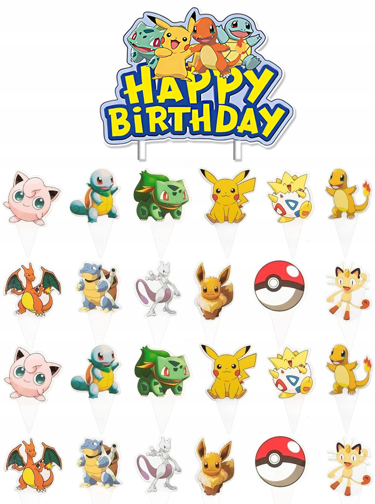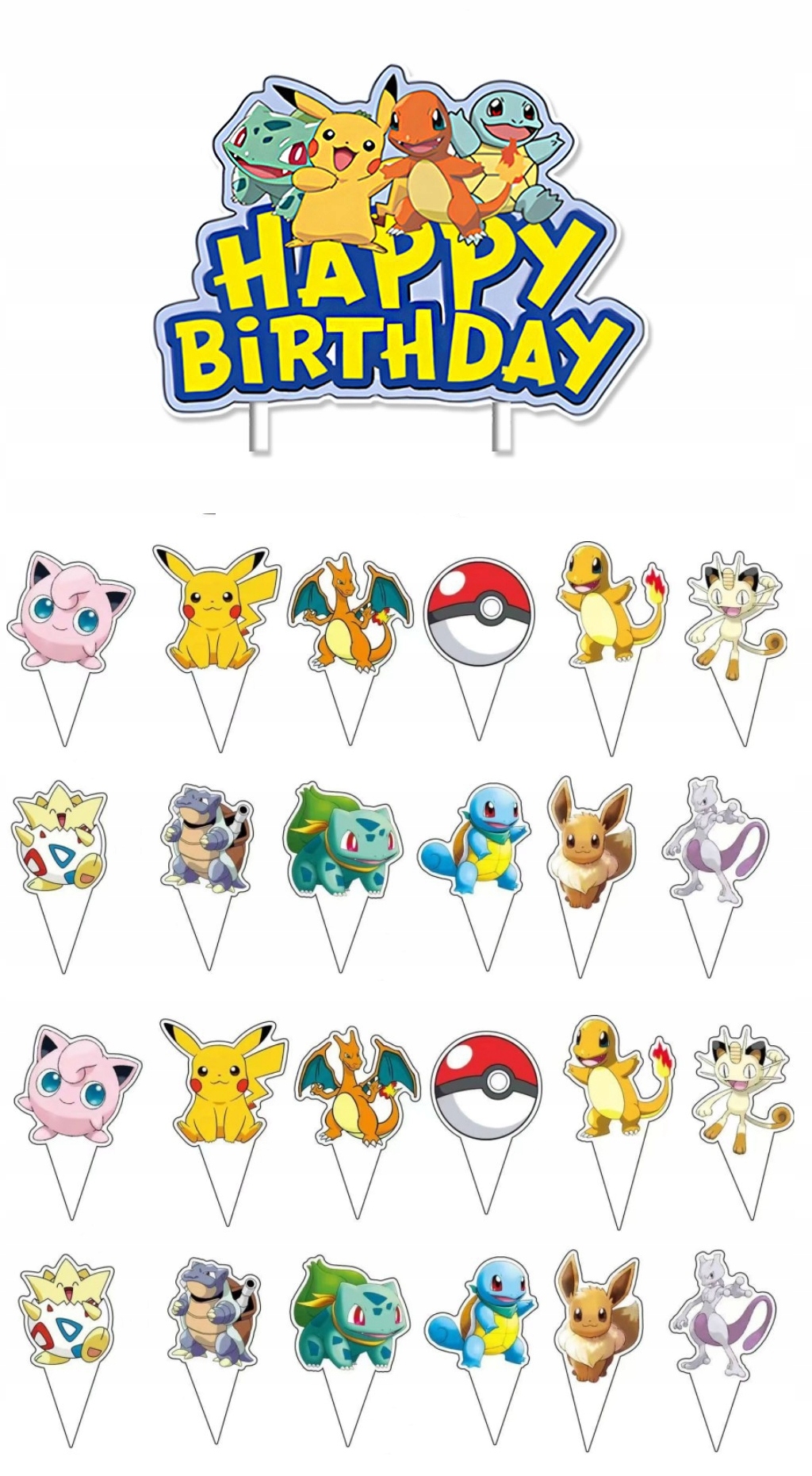 🟡 Toppery Pokémon z Pikachu | Duży Topper na Tort + 24 Toppery na Babeczki | Dekoracje Urodzinowe