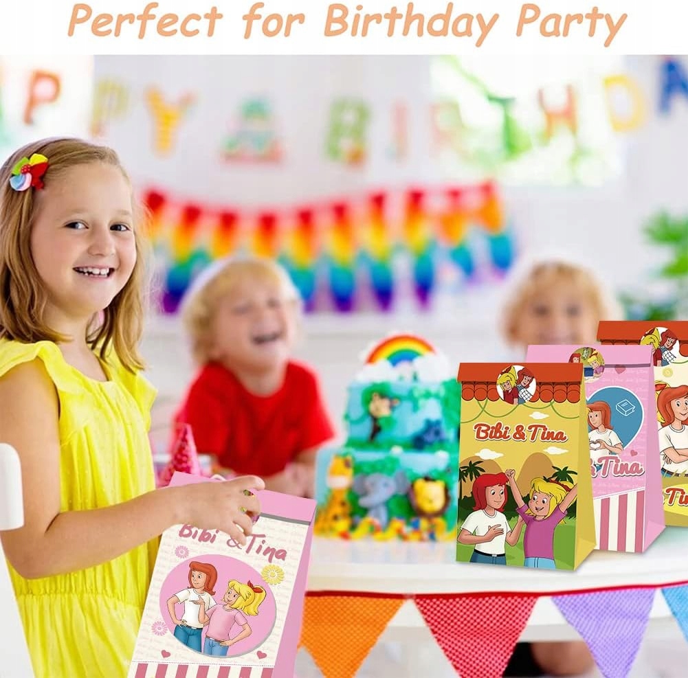 Zestaw 12 kolorowych torebek papierowych z motywem z bajki Bibi i Tina, idealnych na upominki dla gości, słodycze lub drobne prezenty. Torebki wykonane są z wysokiej jakości papieru, są trwałe i estetyczne, a ich bajkowy design zachwyci małych fanów przygód Bibi i Tiny. W komplecie znajdują się również okrągłe naklejki, które umożliwiają łatwe i estetyczne zamknięcie torebek. Doskonałe na urodziny, przyjęcia tematyczne i inne dziecięce wydarzenia!