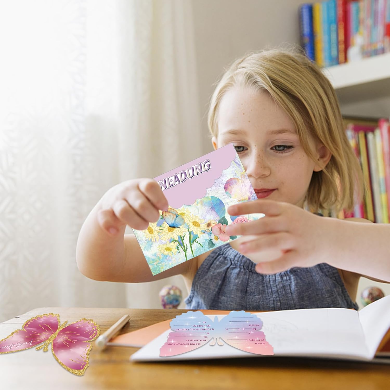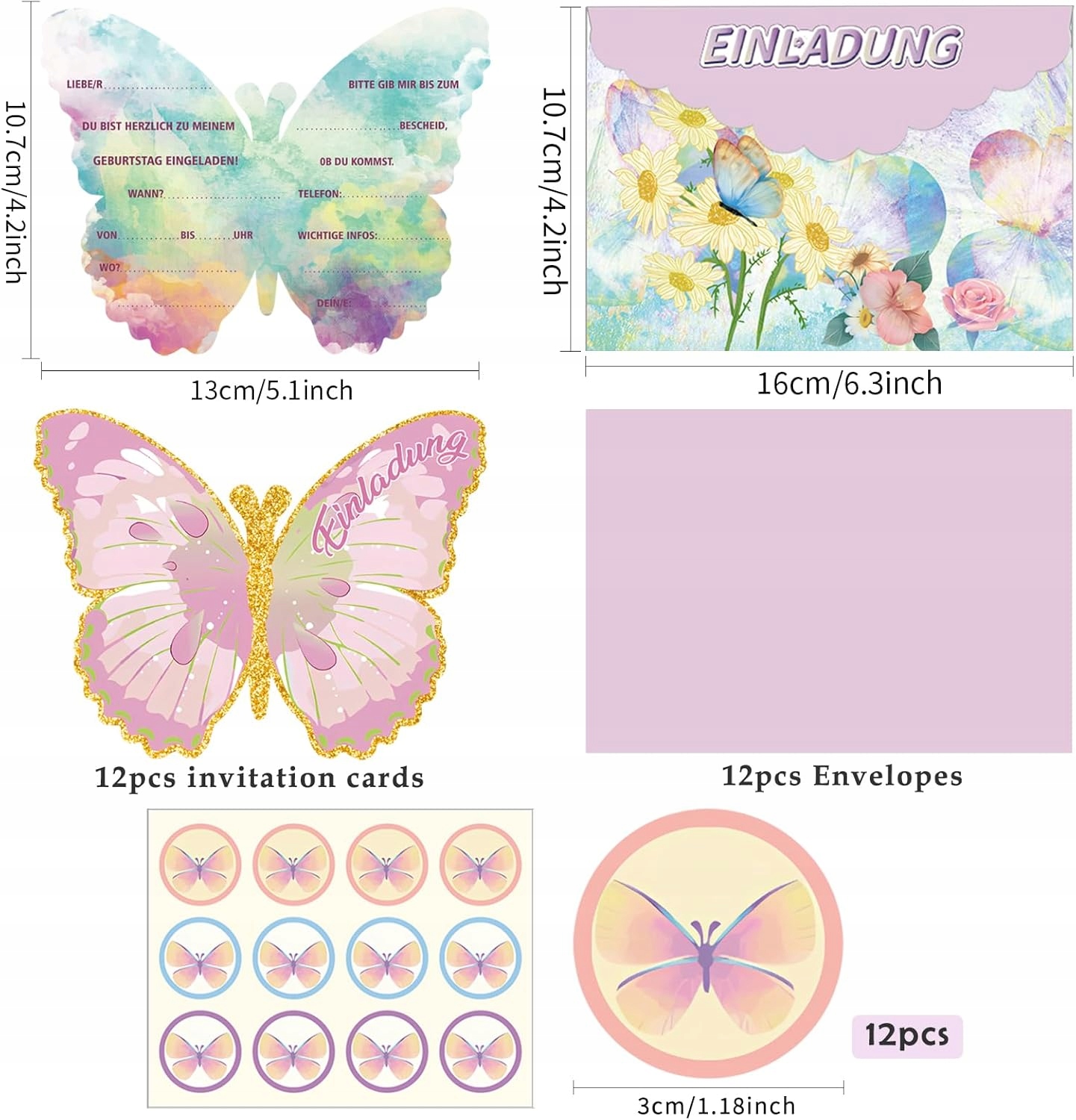ZAPROSZENIA URODZINOWE DLA DZIECI Motyl w j.niemieckim + KOPERTY + NAKLEJKI
