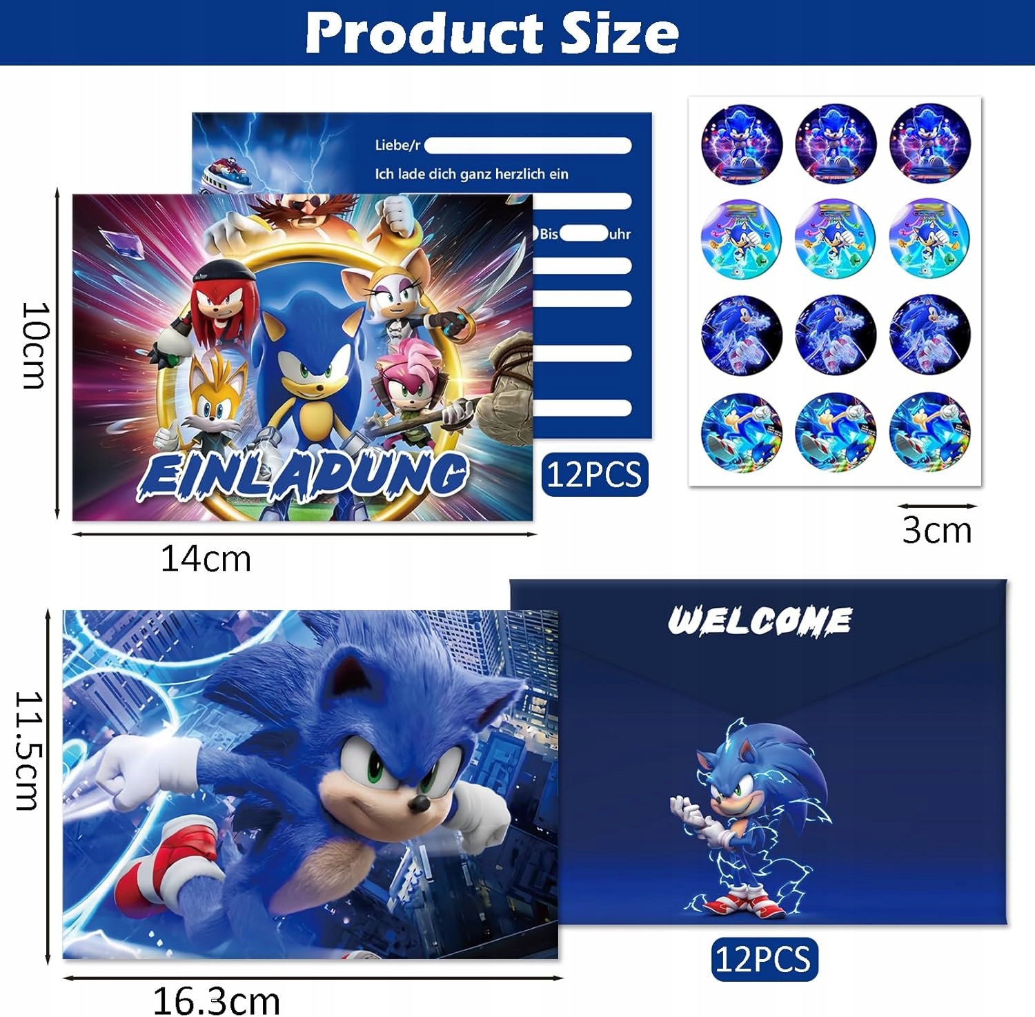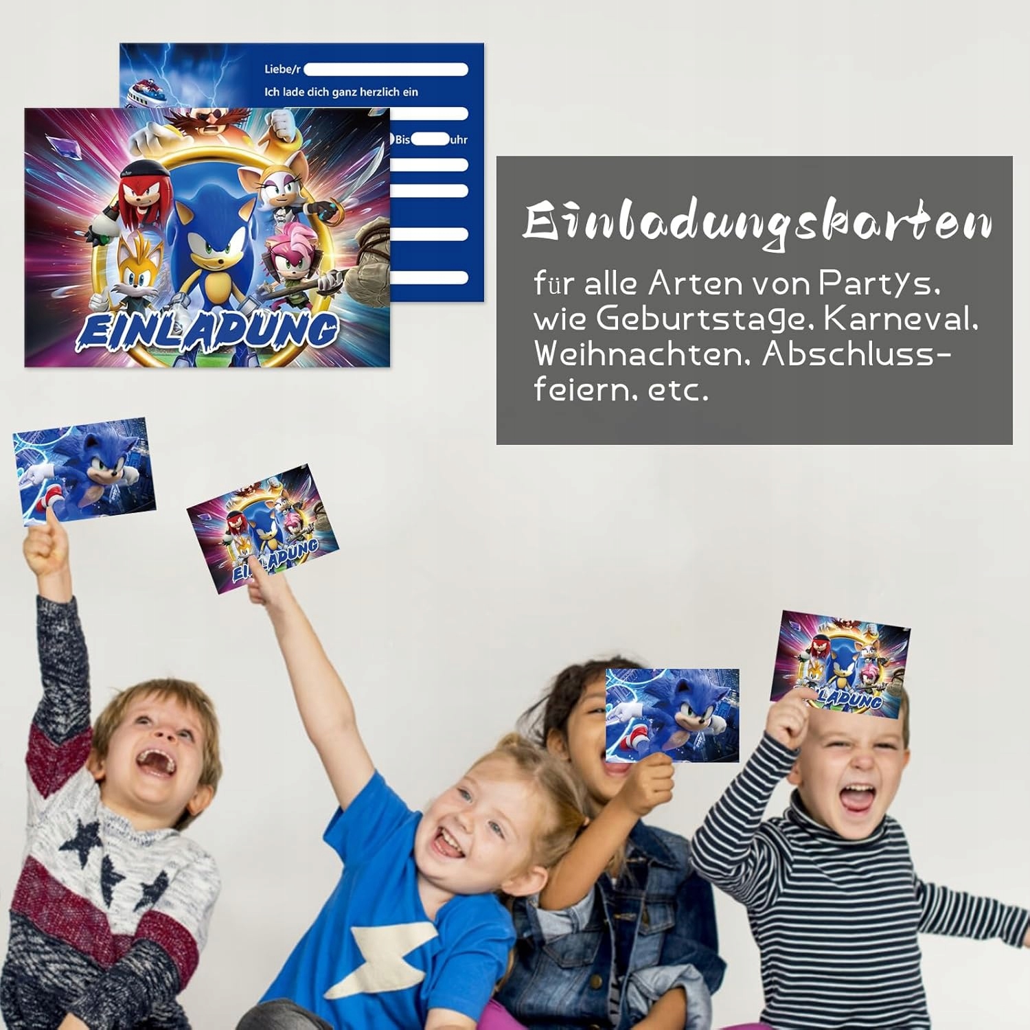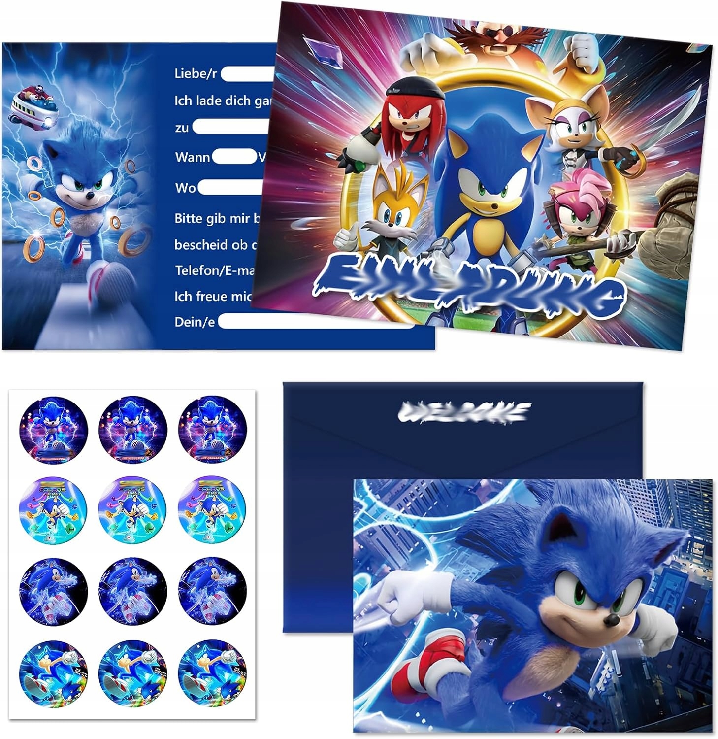 ZAPROSZENIA URODZINOWE DLA DZIECI SONIC w j.niemieckim + KOPERTY + NAKLEJKI