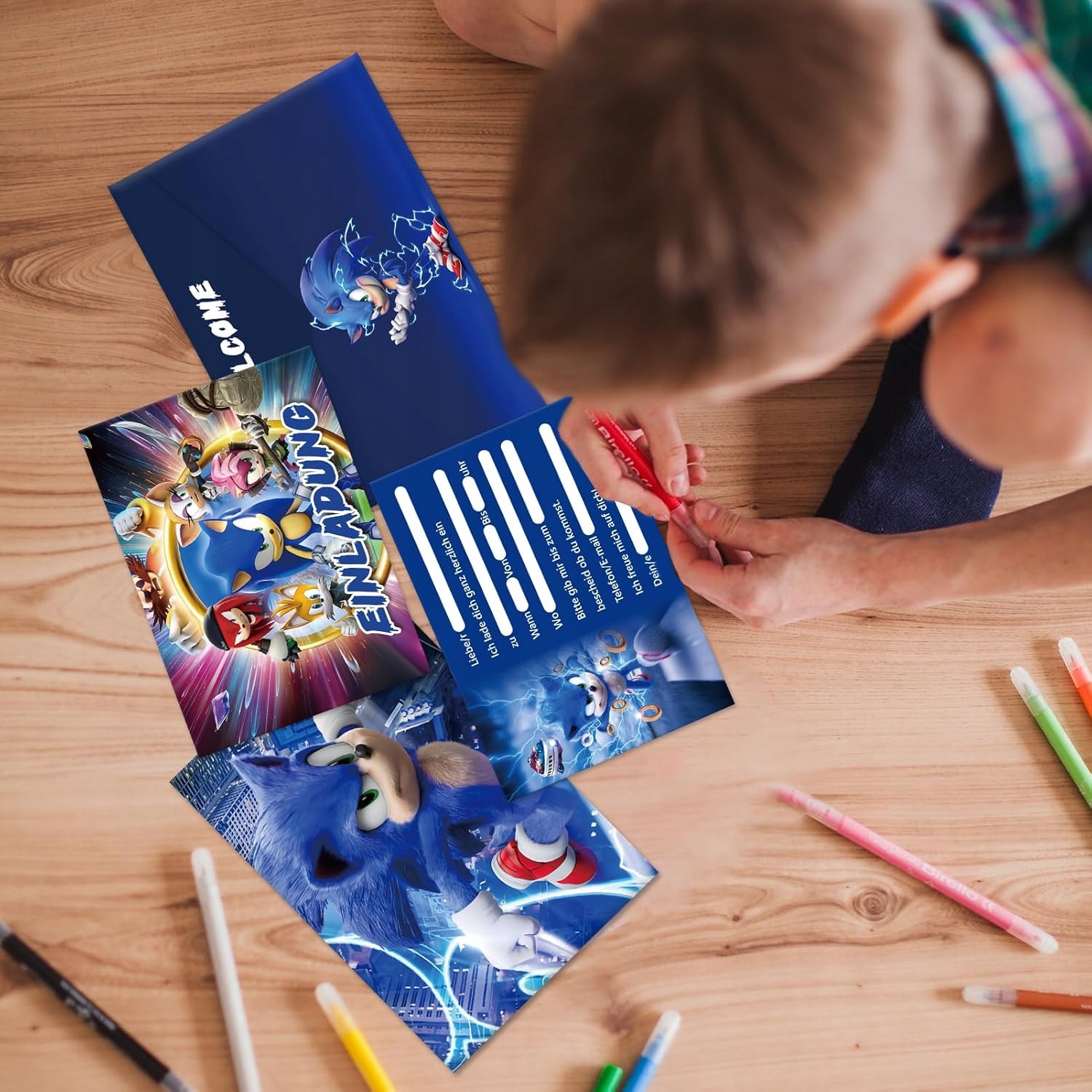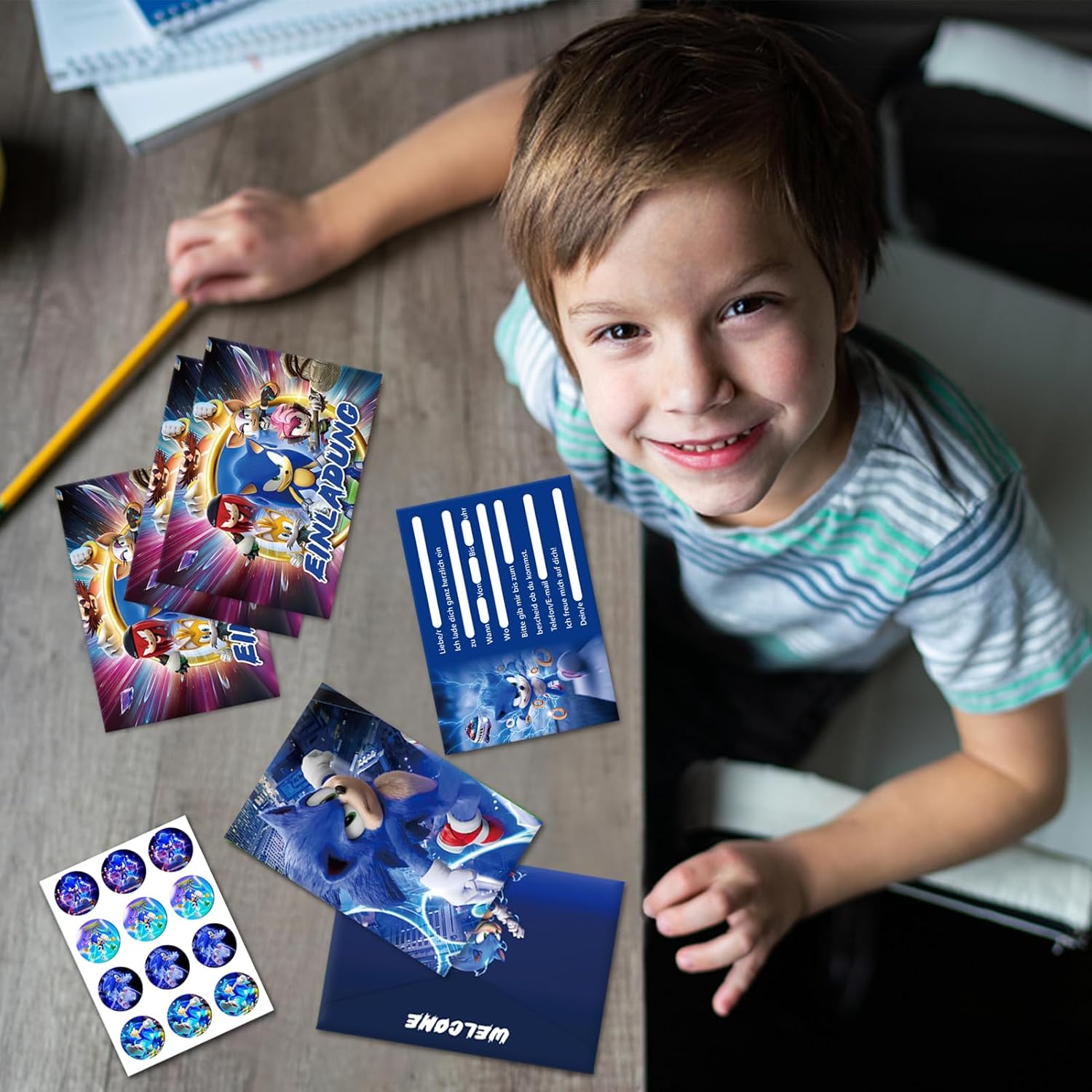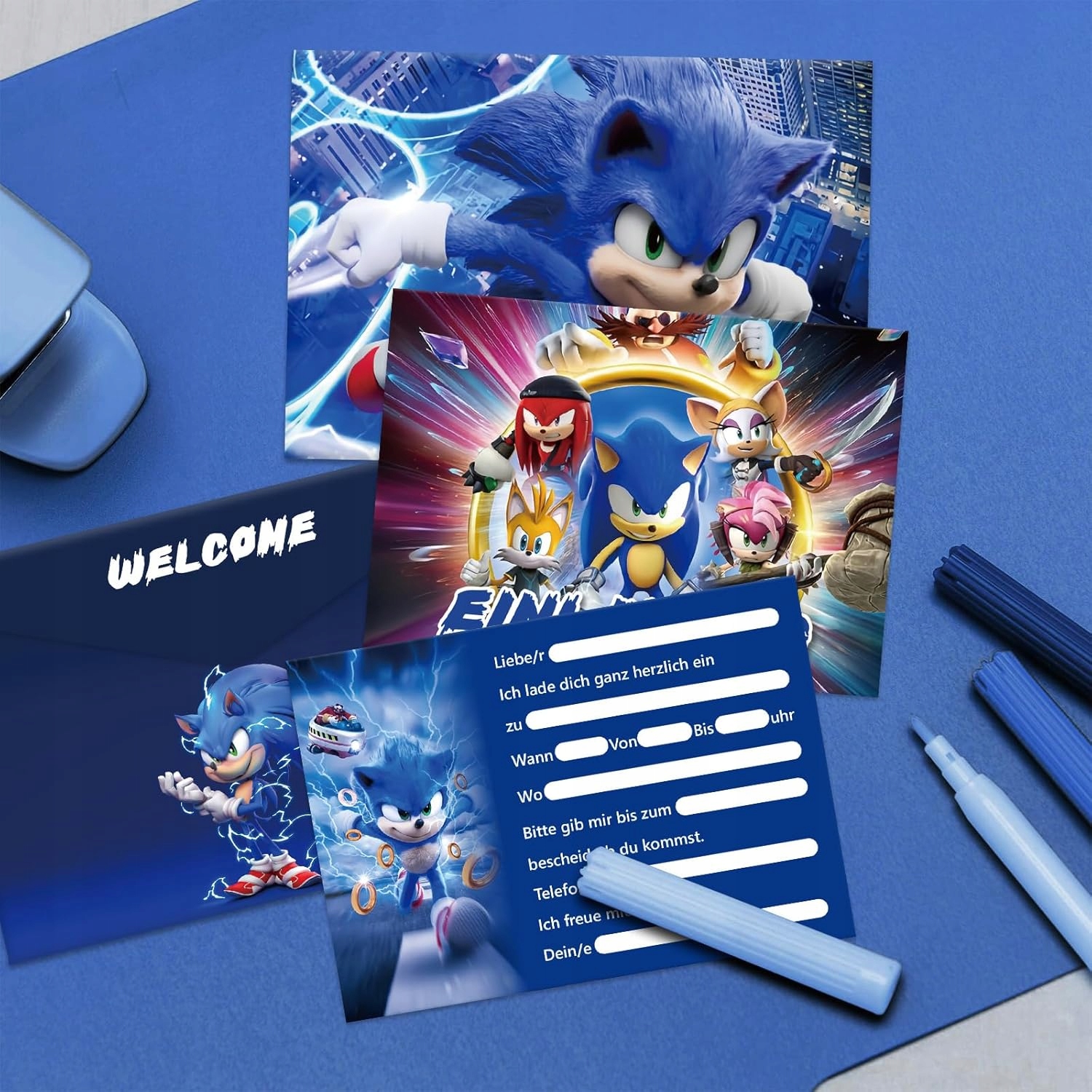 ZAPROSZENIA URODZINOWE DLA DZIECI SONIC w j.niemieckim + KOPERTY + NAKLEJKI