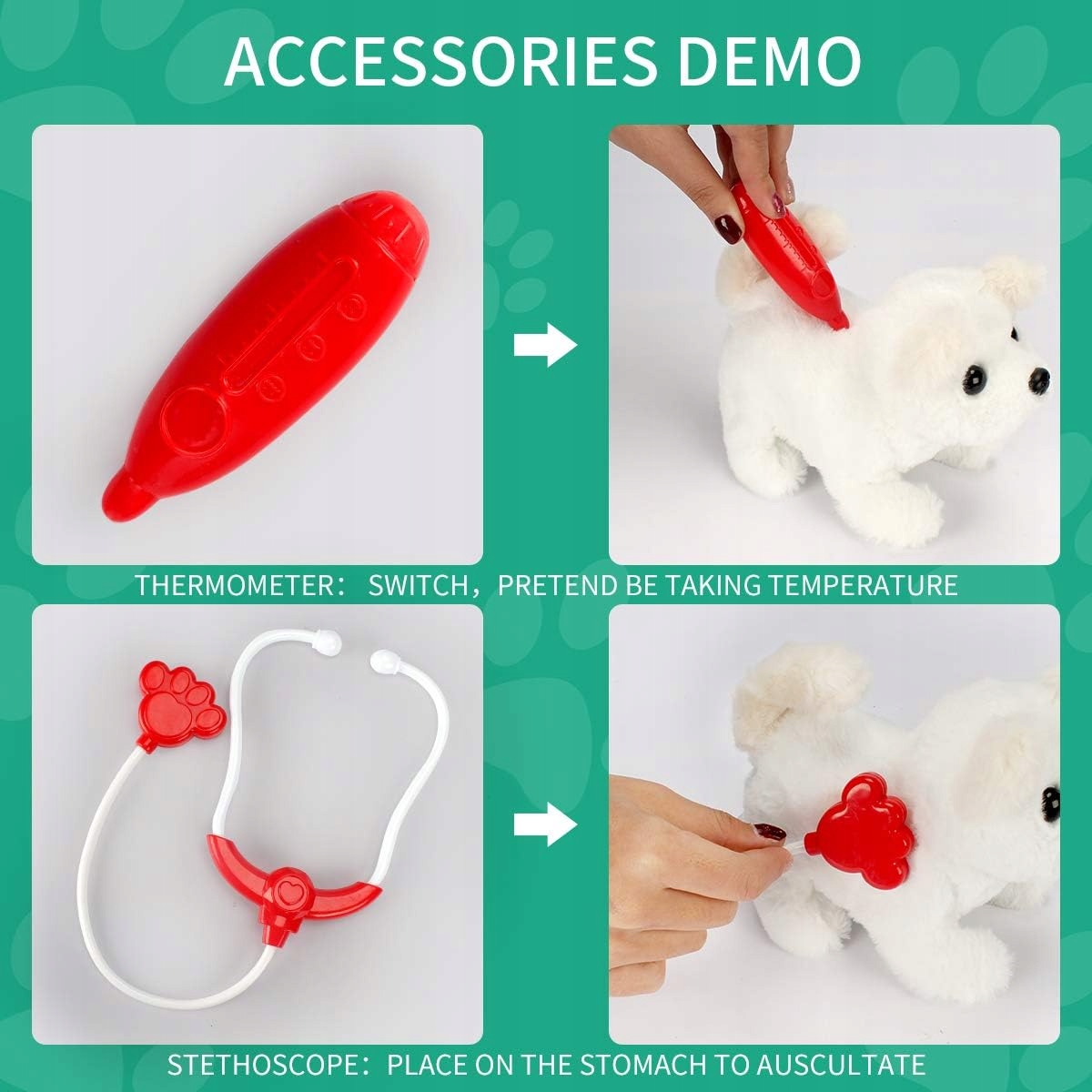 Zestaw jest bogato wyposażony, dzięki czemu sprawdzi się w niejednej medycznej sytuacji. Nauka poprzez zabawę daje niesamowite efekty w przyszłości. Może także to być idealny pomysł na oswojenie dziecka ze zwierzakami i służbą medyczną.